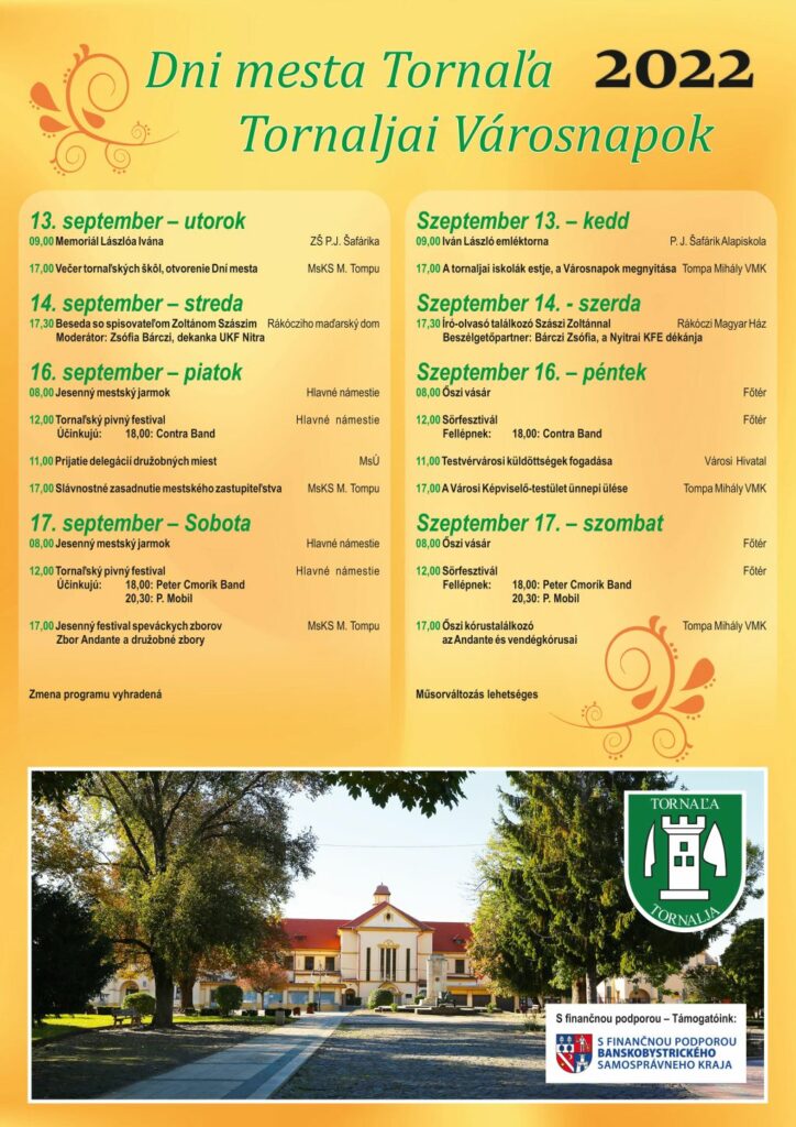 Na stredu 14. septembra je pripravená beseda so spisovateľom Zoltánom Szászim, moderuje ju Zsófia Bárczi, dekanka Univerzity Konštantína Filozofa v Nitre. V piatok 16. septembra sa začne jesenný jarmok. O 17:00 slávnostne zasadne mestské zastupiteľstvo, kde odovzdajú aj Ceny mesta a ďalšie ocenenia. O 18:00 vystúpi Contra Band.