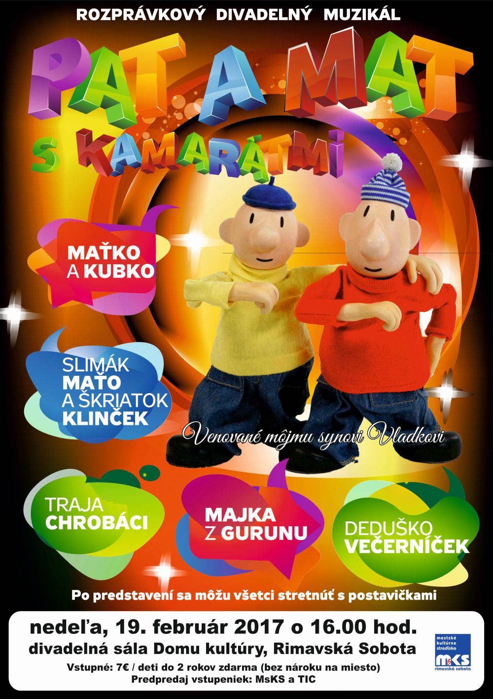 V dome kultúry mysleli aj na najmenších divákov a v nedeľu, 19. februára o 16.00 hod., pre nich pripravili rozprávkový divadelný muzikál PAT A MAT s kamarátmi. V predstavení naživo uvidíte známe rozprávkové postavičky z večerníčkov: Pat a Mat, Maťko a Kubko, slimák Maťo a škriatok Klinček, Traja chrobáci, Majka z Gurunu a nebude chýbať ani Deduško Večerníček. „Deti sa budú môcť s obľúbenými hrdinami vyobjímať a odniesť si pamiatku v podobe spoločnej fotografie,“ uzavrela Jutková. Vstupné je sedem eur a deti do dvoch rokov zdarma (bez nároku na sedadlo). Predpredaj vstupeniek v MsKS a TIC.