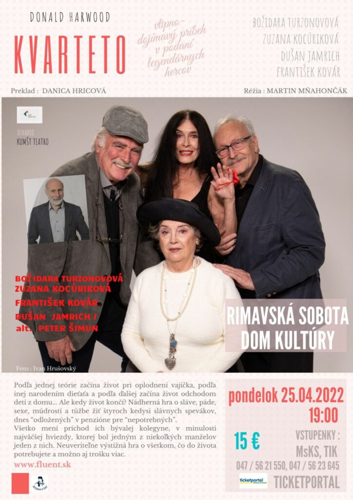 RIMAVSKÁ SOBOTA - V pondelok 25. apríla o 19.00 hod. v divadelnej sále Domu kultúry pokračujeme neuveriteľne výstižnou hrou KVARTETO o všetkom, čo do života potrebujeme a možno aj trošku viac.