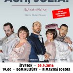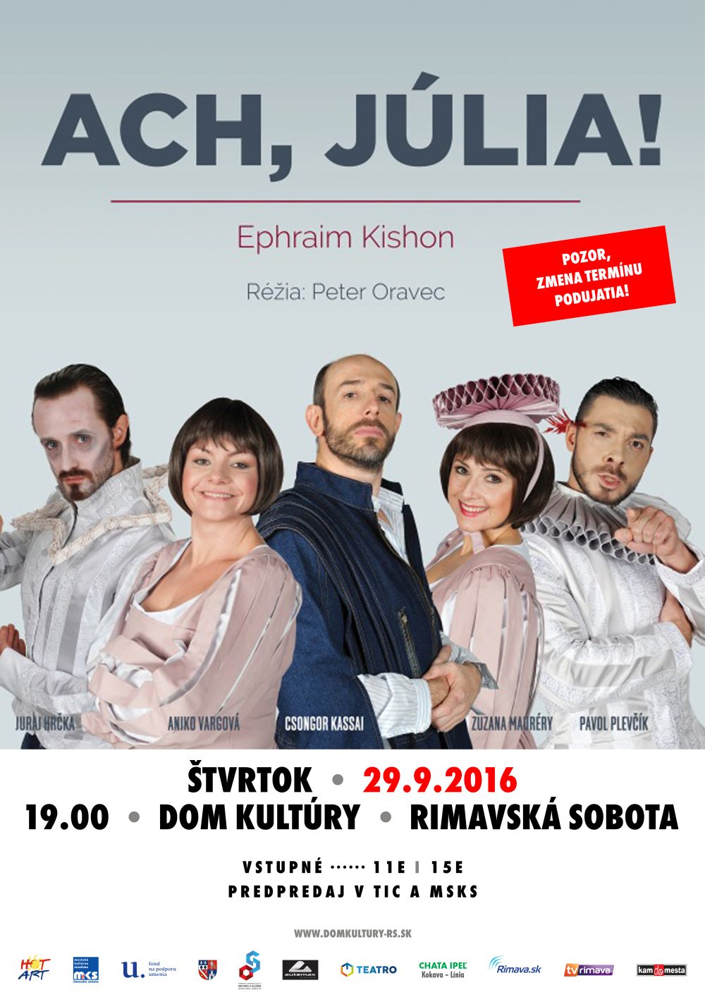 Kultúrne leto HOT ART 2016 – umenie v uliciach mesta Rimavská Sobota uzavrie v predposledný septembrový deň, štvrtok 29. septembra o 19.00 hod. bláznivá komédia z manželského života s výborným hereckým obsadením Ach, Júlia! Och Rómeo! Na vine je Shakespeare. V predstavení plnom zvratov, prevlekov, vtipných situácií, príjemných pesničiek, ale aj trpko-smutných spomienok na slávnu mladosť najznámejších milencov všetkých čias, Rómea a Júlie, si zahrá Csongor Kassai, Zuzana Mauréry alt. Anikó Vargová, Pavol Plevčík alt. Juraj Hrčka. Predstavenie bude v divadelnej sále Domu kultúry. Vstupné: 11 eur v predpredaji v TIC a MsKS / 15eur na mieste.