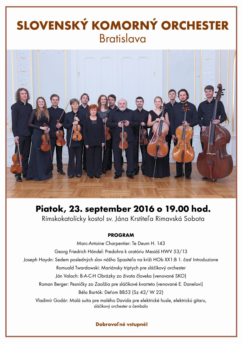 Ďalším hudobným skvostom bude koncert Slovenského komorného orchestra, ktorý ponúkne svoje umenie všetkým obyvateľom Rimavskej Soboty v piatok, 23. septembra o 19.00 hod. v rímskokatolíckom kostole. V sezóne 2015/2016 si tento súbor, jeden z najpopulárnejších v oblasti klasickej hudby, pripomenul 55. výročie svojho založenia. Podľa vyjadrenia Milany Jutkovej, riaditeľky MsKS, je koncert súčasťou programu 34. ročníka Gemersko-malohontského jarmoku a podľa jej slov je veľkým potešením, že tento kolektív zavíta do Rimavskej Soboty. „Program spestrí aj vystúpenie kapely Ferkovci – Gipsy king revival a klasická slovenská a maďarská cigánska muzika a hviezdou pódia bude Peter Šrámek, ktorý je dobre známy z televíznych obrazoviek, najmä z maďarskej verzie súťaže Tvoja tvár znie povedome (Sztárban sztár),“ uzavrela Jutková a dodala, že Gemersko-malohontský jarmok sa uskutoční v dňoch 23. – 24. septembra.