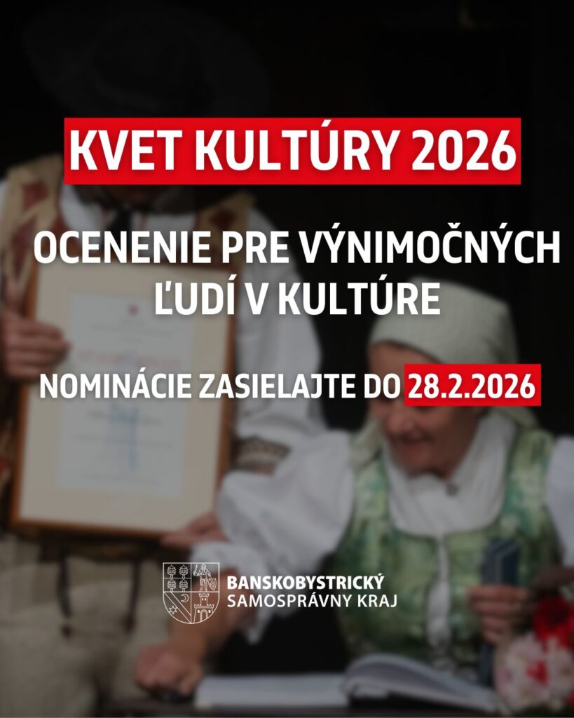 Ak niekoho takého poznáte a myslíte si, že by si zaslúžil ocenenie Kvet kultúry a umenia, svoje návrhy môžete posielať do 28. februára 2026.