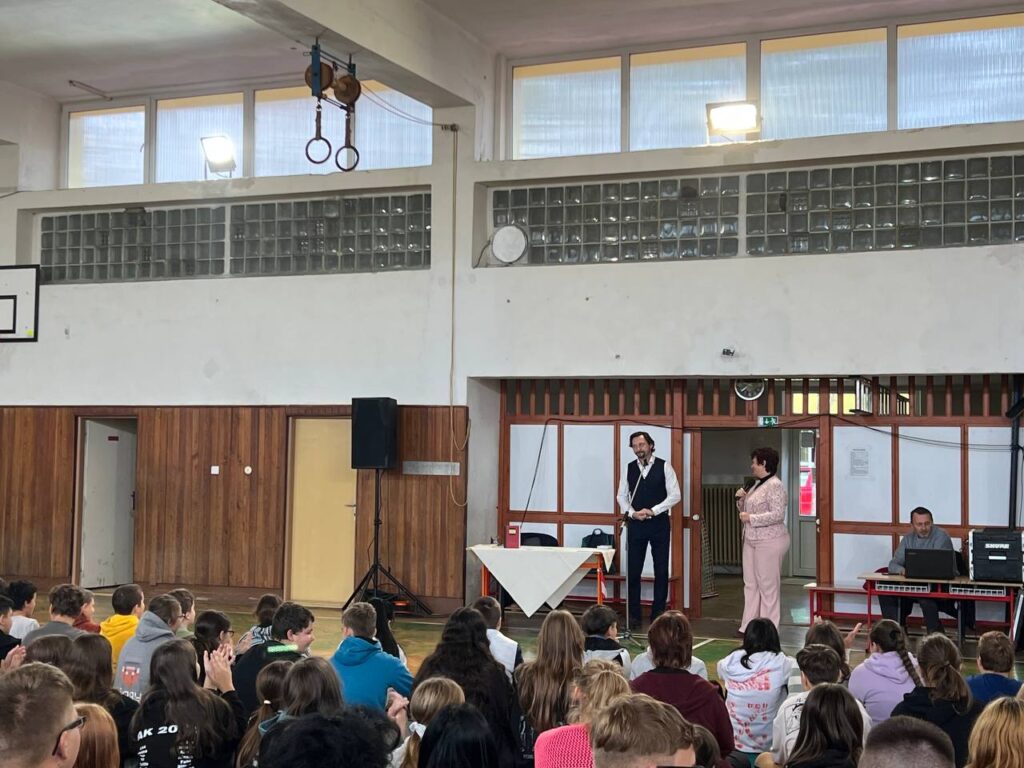 RIMAVSKÁ SOBOTA – Po jesenných prázdninách čakala na niektorých žiakov v Rimavskej Sobote milá návšteva. Základnú školu Petra Kellnera Hostinského a Gymnázium Ivana Kraska navštívil slovenský herec, komik a glosátor Lukáš Latinák.