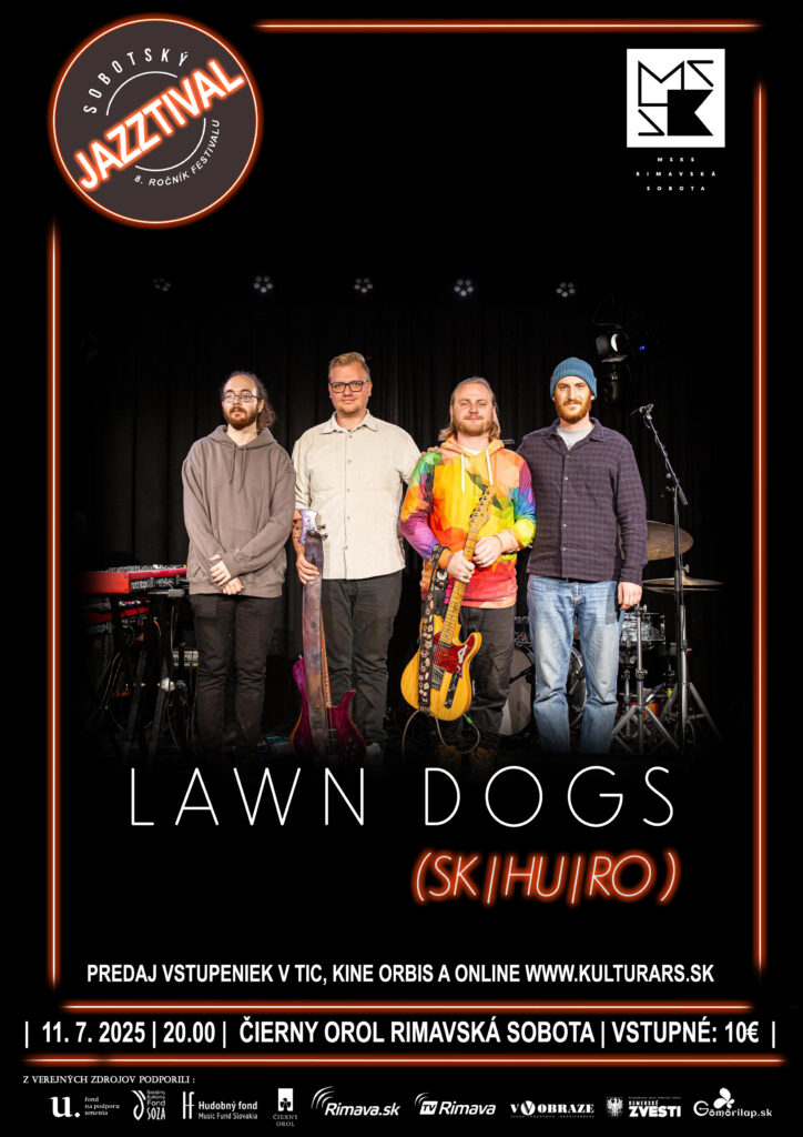 Sobotský Jazztival privíta v piatok 11. júla o 20.00 hod. na nádvorí Čierneho orla jednu z najzaujímavejších mladých kapiel súčasnej domácej scény — Lawn Dogs. Skupina, ktorá si získava čoraz širšie publikum doma aj v zahraničí, ponúkne návštevníkom pestrú jazdu na pomedzí jazzu, fusionu a elektroniky.