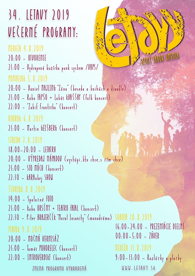 Letný tábor výtvarníkov, literatúry, fotografie a divadla LETAVY, jeden z najznámejších európskych umeleckých workshopov, prinesie počas najbližšieho týždňa viacero hudobných koncertov. Počas najbližších dní nebudú chýbať happeningy, autorské čítania, divadelné študentské predstavenia, improvizácie či prednášky na rôzne témy. Vo večerných programoch sa môžu podľa organizátorov účastníci tešiť na koncerty STO MÚCH, Martina Geišberga, Jakuba Ursínyho a Teatro Fatal, či Tomáša Pohorelca. Ale aj na besedu s dramaturgom SND Danielom Majlingom, či monodrámu Petra Brajerčíka: Moral Insanity (vysoko ocenenú na viacerých umeleckých fórach). „V posledných dňoch sa počet účastníkov výrazne zvýši o ďalšie desiatky tých, ktorí z rôznych dôvodov nemohli byť prítomní od začiatku,“ priblížil pre Rimava.sk zakladateľ a organizátor tábora, Marian Lacko. Letavy začínajú dnes, 4. augusta.