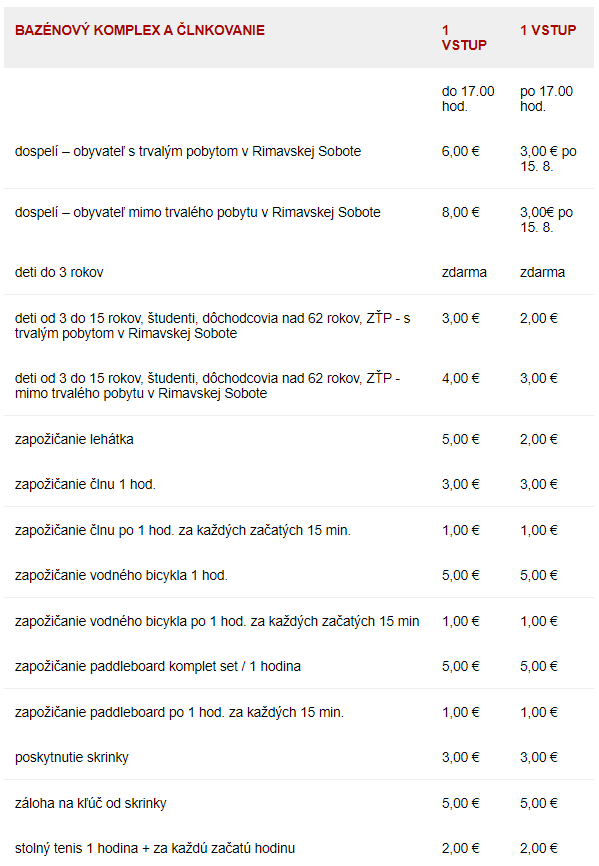 Cenník zostáva rovnaký ako minulý rok. Jednorázový vstup pre dospelú osobu s trvalým pobytom v Rimavskej Sobote je 6 eur. Deti od 3 do 15 rokov, študenti, dôchodcovia nad 62 rokov, a ZŤP s trvalým pobytom v Rimavskej Sobote zaplatia 3 eurá.