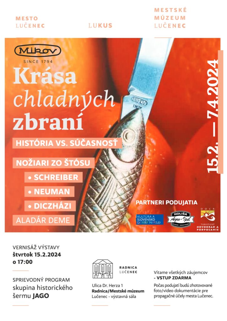 LUČENEC –V Mestskom múzeu v Lučenci otvoria tohtoročnú výstavnú sezónu pokračovaním úspešného podujatia Krása chladných zbraní. Tento ročník sa zamerali na prezentáciu lokality s tristoročnou tradíciou výroby nožov.
