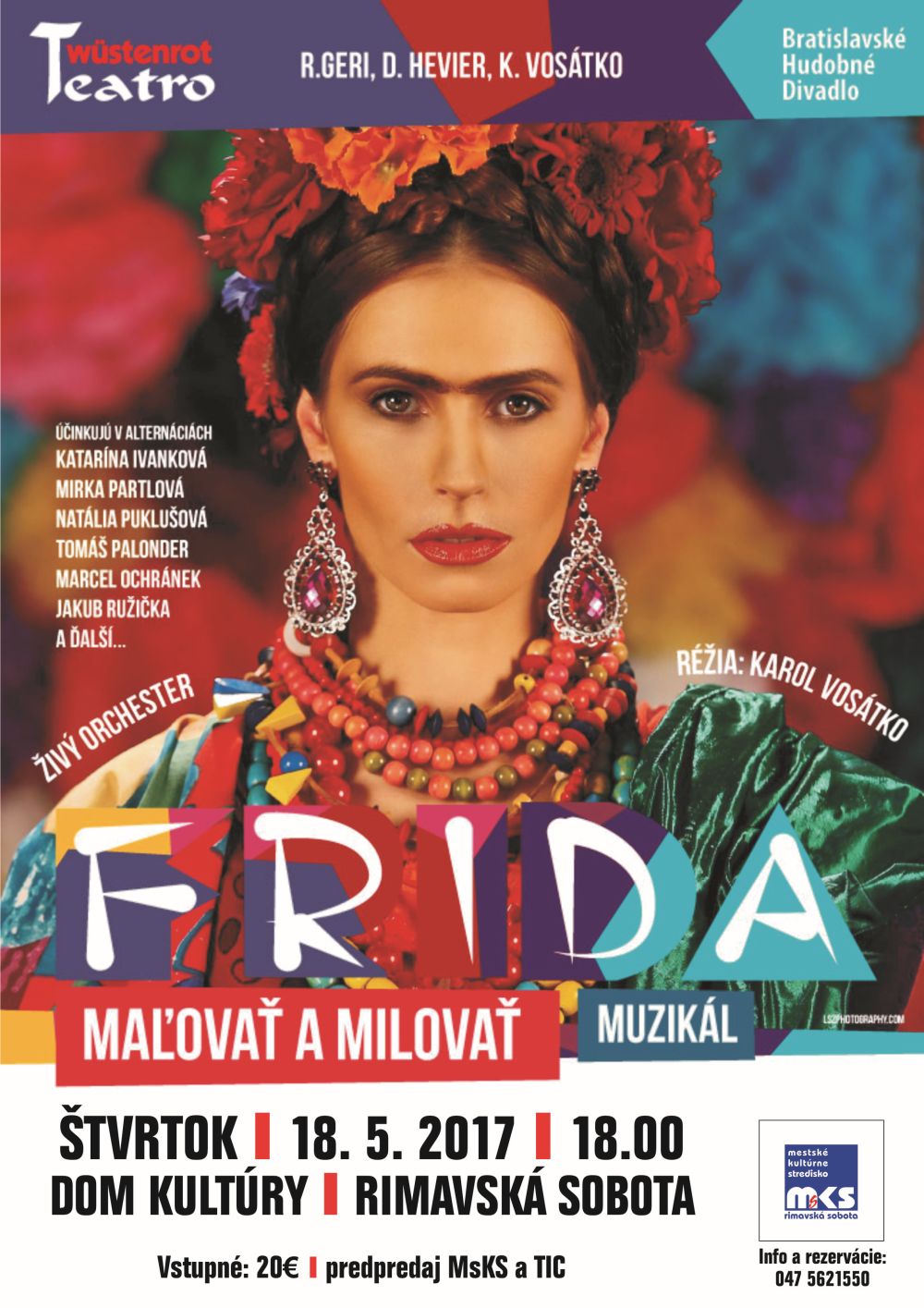 Mestské kultúrne stredisko s Teatrom Wüstenrot prinesú vo štvrtok, 18. mája o 18.00 hod., do Rimavskej Soboty pôvodný slovenský muzikál o životnom príbehu legendárnej mexickej maliarky Fridy Kahlo. FRIDA - Maľovať a milovať je muzikál s hudbou skladateľa a producenta Rudolfa Geriho v podaní živého orchestra, autora libreta a textov piesní Daniela Heviera a spoluautora libreta a režiséra Karola Vosátka.
