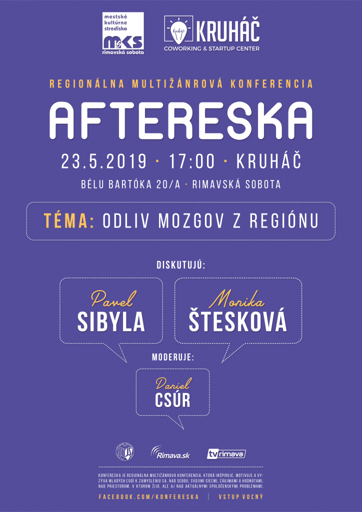 Konfereskou sa však inšpiratívny štvrtok nekončí. Mestské kultúrne stredisko totiž spojilo sily s Kruháčom – Coworking & StartUp Centrom a spoločne organizujú diskusiu na tému Odliv mozgov z regiónu. S Monikou Šteskovou a Pavlom Sibylom sa bude zhovárať Daniel Csúr. Podujatie s príznačným názvom Aftereska štartuje o 17:00 hod. v Kruháči a vstup naň je – tak ako v prípade Konferesky, pre všetkých záujemcov bezplatný.