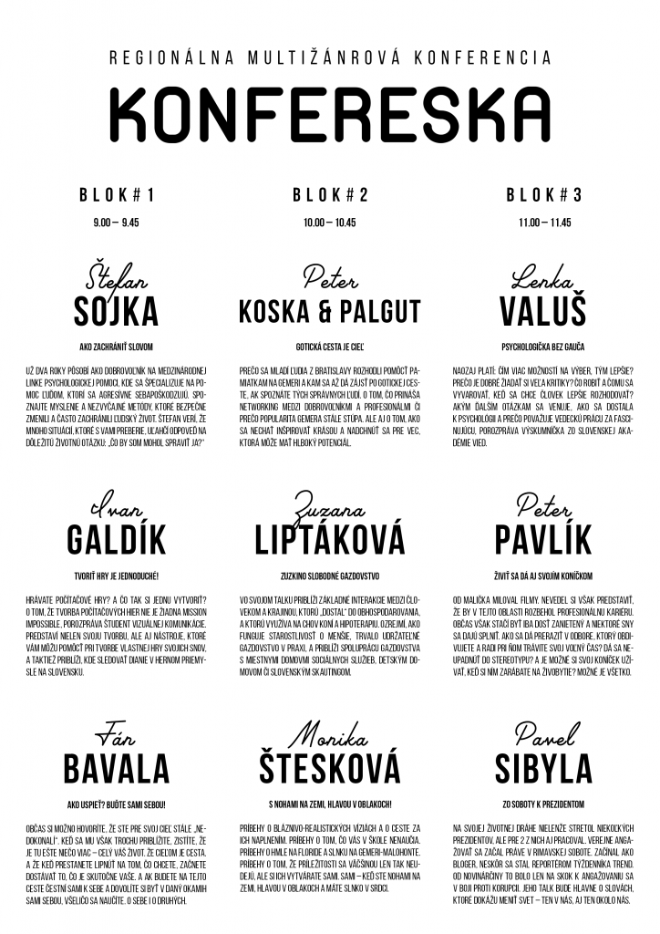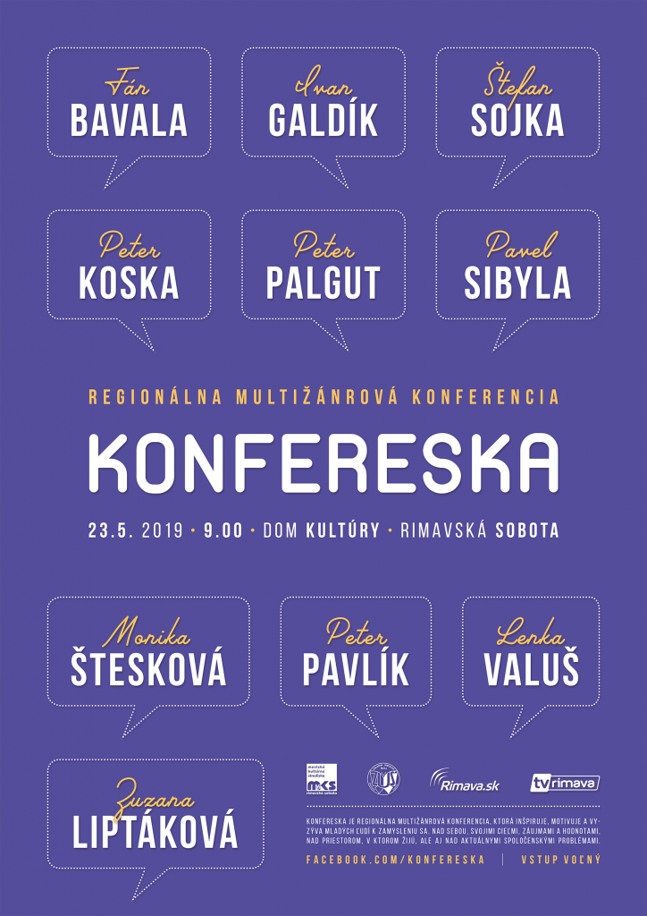 Po mimoriadnom úspechu predchádzajúcich dvoch ročníkov, ktorých sa zúčastnilo takmer 600 študentov, prichádza Mestské kultúrne stredisko v Rimavskej Sobote s tretím pokračovaním regionálnej multižánrovej konferencie pre mládež. Jarná edícia Konferesky sa uskutoční už tento štvrtok, 23. mája od 9:00 hod. v divadelnej sále Dome kultúry. „Cieľom konferencie je inšpirovať a motivovať mladých ľudí k tomu, aby sa realizovali, ale aj zamysleli – nad sebou, svojimi cieľmi, záujmami a hodnotami, nad priestorom, v ktorom žijú, ale aj nad aktuálnymi spoločenskými problémami. Konfereska chce mladým ľuďom ukázať, že aj z ich regiónu vzišlo množstvo šikovných, talentovaných a úspešných osobností, ktoré sa dokázali presadiť v rozličných oblastiach,“ priblížil pre Rimava.sk autor projektu Tomáš Bálint.