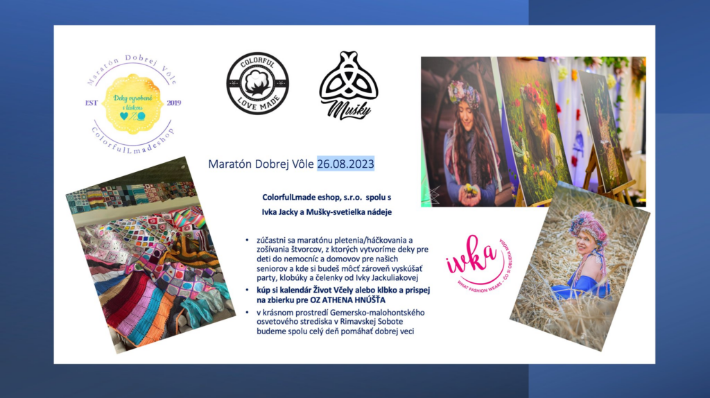 Ide už o v poradí dvadsiaty tretí Maratón dobrej vôle. "V krásnom prostredí Gemersko-malohontského osvetového strediska v Rimavskej Sobote budeme celý deň pomáhať dobrej veci spoločne s ColorfulLmadeshop. Tešíme sa na všetkých dobrovoľníkov nielen z Rimavskej Soboty, ale aj zo širokého okolia, pre ktorých máme pripravené celodenné občerstvenie,“ pozýva spoluorganizátorka Jackuliaková.