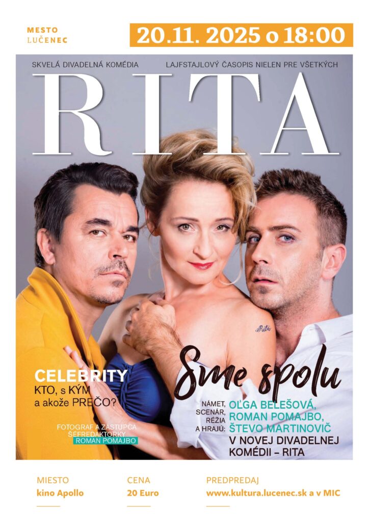 Kino Apollo v Lučenci privíta vo štvrtok 20. novembra 2025 o 18:00 hodine divadelnú komédiu Rita, ktorú spoločne vytvorili a naštudovali populárni herci Oľga Belešová, Roman Pomajbo a Števo Martinovič. Predstavenie divákom umožní nahliadnuť do zákulisia redakcie lifestylového časopisu počas prípravy jeho prvého vianočného čísla.