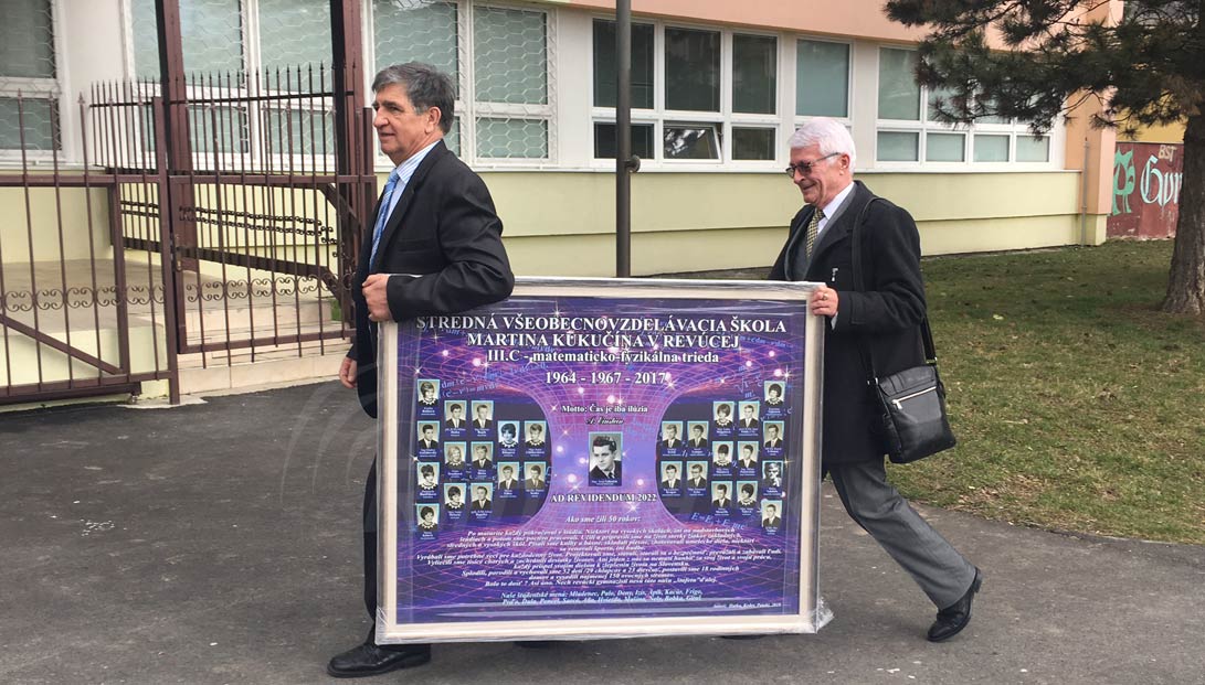 Keď sa nedávno stretli, presne na deň učiteľov na gymnáziu v Revúcej, takmer im tiekli z očí aj slzy dojatia a šťastia. „Po toľkých rokoch to bolo nádherné, pretože sme sa stretli z dôvodu uvedenia nášho tabla konečne do života po dlhom polstoročí,“ povedalo desať bývalých maturantov z roku 1967. „Deviati nemohli prísť z rôznych dôvodov, ale verím, že si toto tablo prídu niekedy pozrieť a ešte sa všetci spolu na ďalšom stretnutí aj zídeme,“ dodal Milan Hutka. Na stretnutí, kde zavesili svoje tablo nechýbal ani riaditeľ školy i primátorka Revúcej, ktorým odovzdali malú kópiu tabla. Spoločne si zaspievali Gaudeámus a niekoľko hodín spomínali na všetko krásne, čo spolu v škole zažili. Nad hlavami konečne aj so svojim tablom.