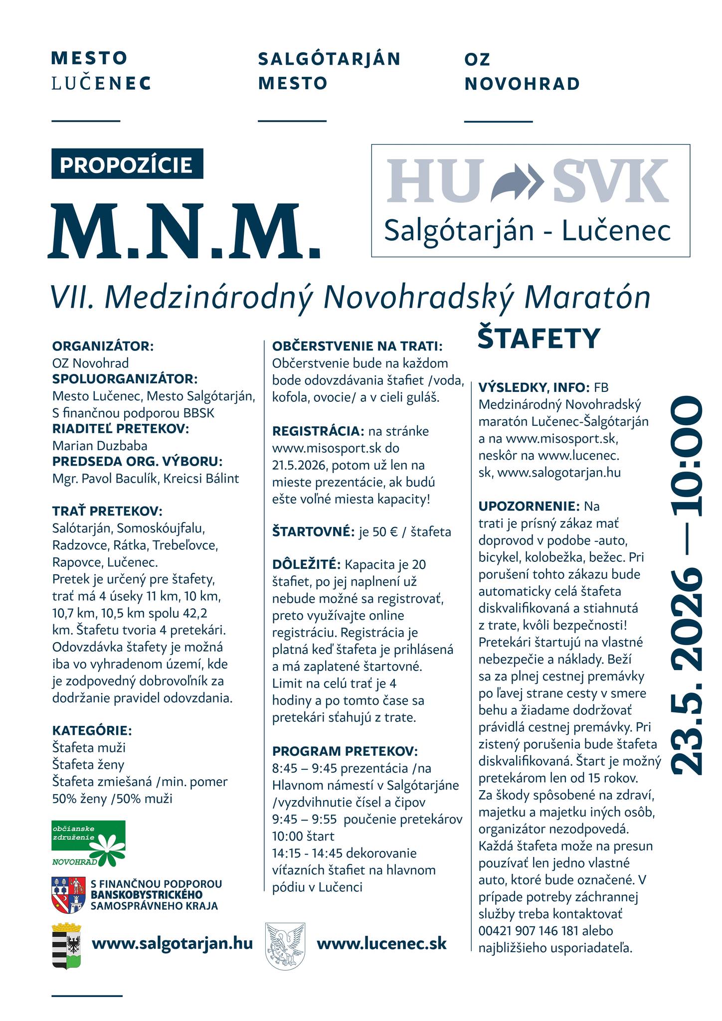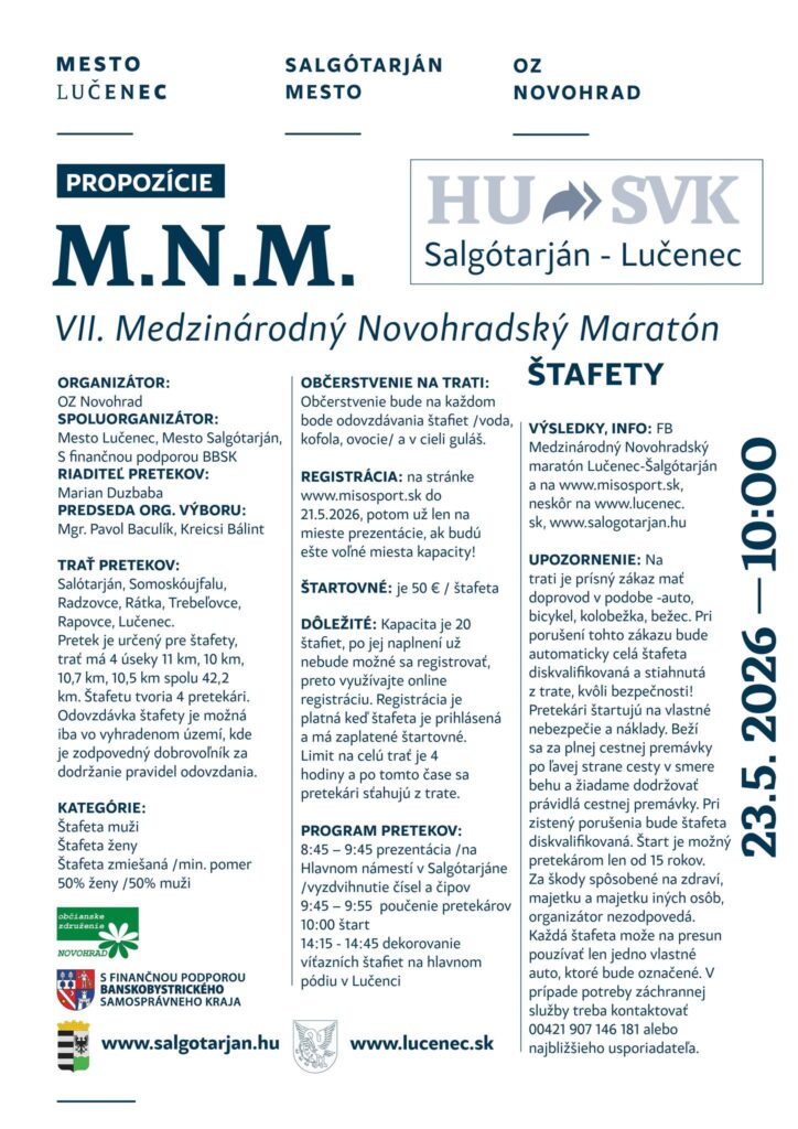 VII. Medzinárodný Novohradský Maratón je dôkazom, že beh dokáže spájať nielen ľudí, ale aj mestá, regióny a krajiny. Ak hľadáte podujatie, kde sa šport mení na zážitok, kde sa prekonávajú osobné hranice a kde v cieli čaká nielen úspech, ale aj silný pocit spolupatričnosti, 23. mája 2026 by ste mali byť na štarte. Pretože niekedy tie najlepšie príbehy začínajú práve prvým krokom.