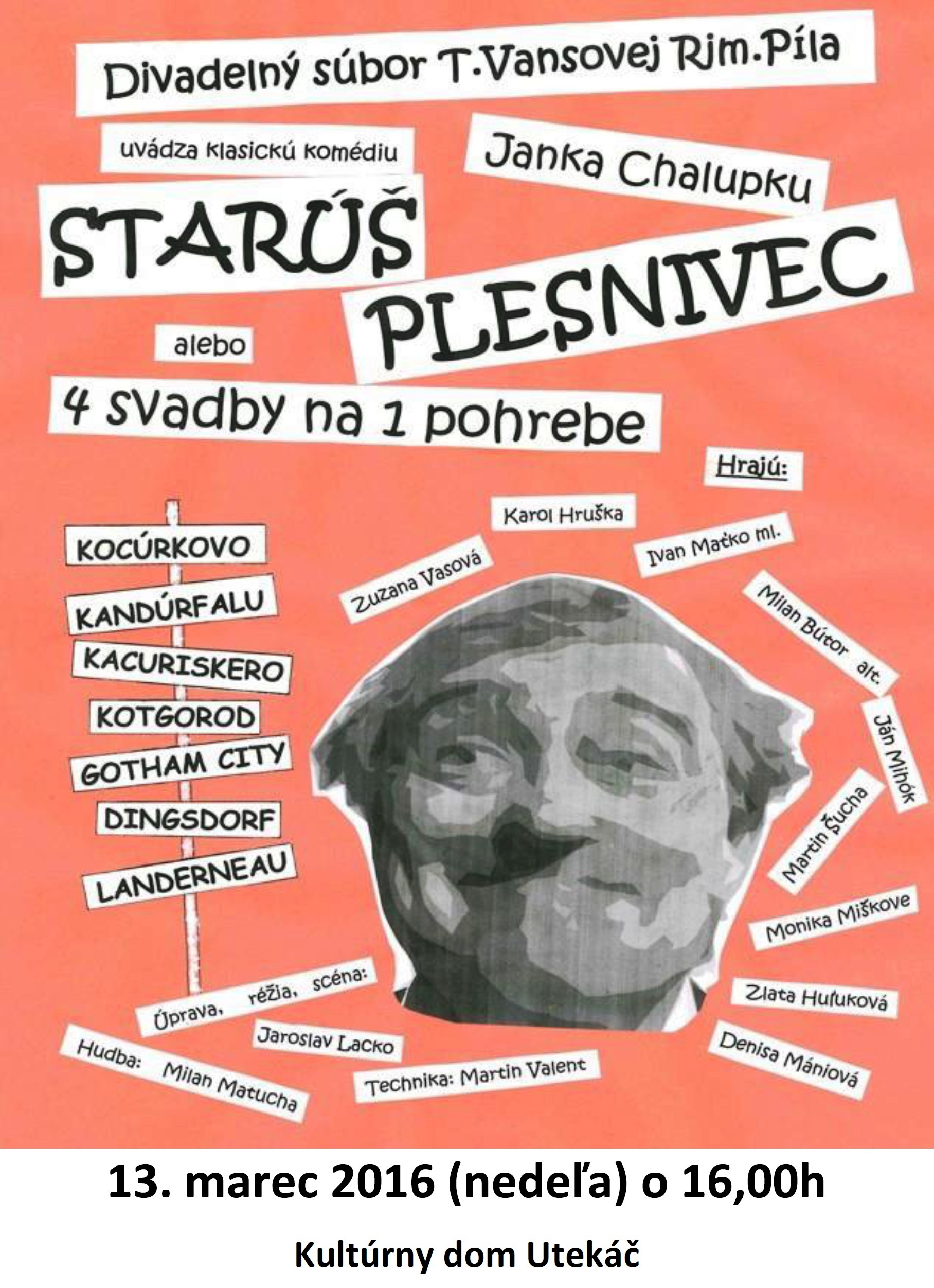 V tú istú nedeľu, 13. marca, obsadí podľa manažérky divadelné dosky kultúrneho domu v Utekáči Divadelný súbor T. Vansovej z Rimavskej Píly s klasickou komédiou Starúš plesnivec alebo štyri svadby na jednom pohrebe od Janka Chalupku.