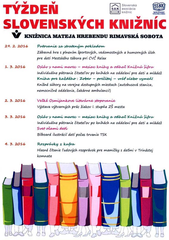 Podujatia tretieho mesiaca začnú Týždňom slovenských knižníc. V tej rimavskosobotskej si pracovníci knižnice pripravili rôzne podujatia pre malých čitateľov. Od utorka, 1. marca, Knižnica Mateja Hrebendu v Rimavskej Sobote odštartuje celomestskú akciu s názvom Kniha pre každého. Ako ďalej Rimava.sk informovala Eva Novotná, ide o akciu, počas ktorej uložia na niektoré verejne prístupné miesta krabice plné kníh. Podľa jej slov, každý kto si bude chcieť skrátiť chvíľku čakaním u lekára alebo autobusu si bude môcť zobrať knihu z krabice. „Knihu si ľudia môžu zadarmo zobrať, ktorú po prečítaní buď vrátia späť do krabice alebo si ju môžu nechať prípadne vymeniť za nejakú zo svojich, ktorá by podľa nich potešila niekoho druhého,“ priblížila Novotná.