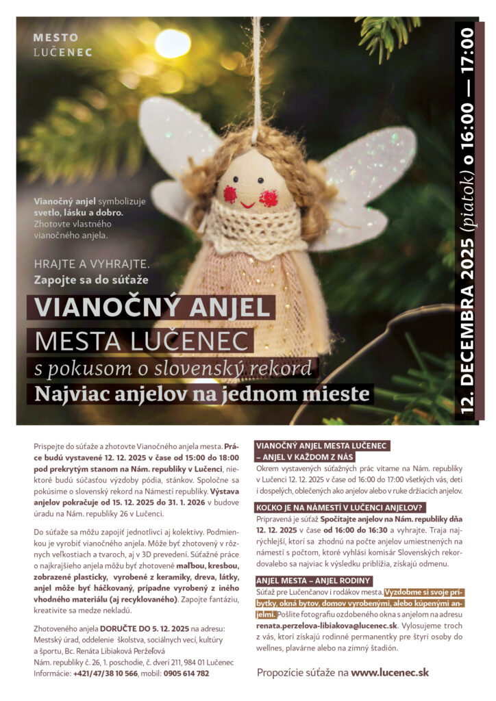 Anjelská tematika sa premietne do viacerých sprievodných aktivít. Mesto vyhlásilo kreatívnu súťaž "Vianočný anjel mesta Lučenec", ktorej vyhodnotenie je naplánované na rovnaký deň ako pokus o rekord. Súťažné diela budú najprv vystavené pod krytým stanom na námestí a následne sa presunú do foyeru mestského úradu, kde ich bude možné obdivovať až do konca januára 2026.