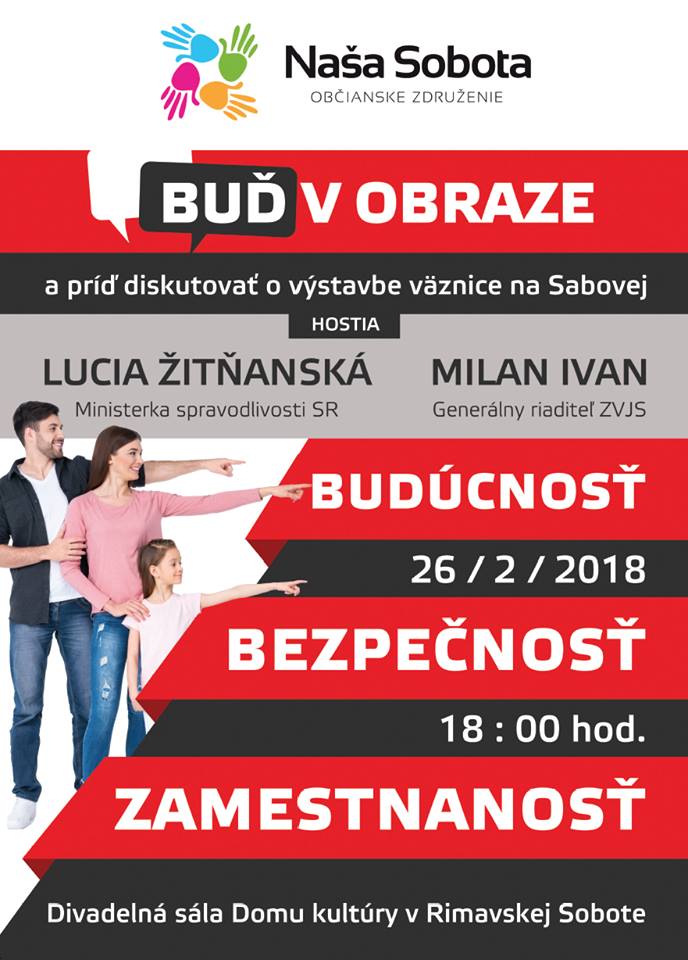 V uplynulých mesiacoch sa na verejnosti čoraz viac skloňuje zámer vlády postaviť na Sabovej pri Rimavskej Sobote väznicu pre stovky odsúdených. Ide o nové zariadenie popri už existujúcom Otvorenom oddelení, ktoré tu funguje už roky. S novou väznicou sa má zvýšiť počet odsúdených, v minimálnom, strednom ale aj v maximálnom stupni stráženia. Zámer výstavby nového zariadenia prišla do Rimavskej Soboty na úrovni šéfov samospráv a médií odprezentovať začiatkom tohto roka ministerka spravodlivosti Lucia Žitňanská. Jej ďalšia návšteva bude však najbližšie zameraná na verejnosť. Pozvanie občianskeho združenia Naša Sobota ministerka prijala a o výstavbe väznice tak príde diskutovať spolu aj s generálnym riaditeľom ZVJS Milanom Ivanom. Verejná diskusia začína v divadelnej sále Domu kultúry v pondelok, 26. februára o 18.00 hodine.