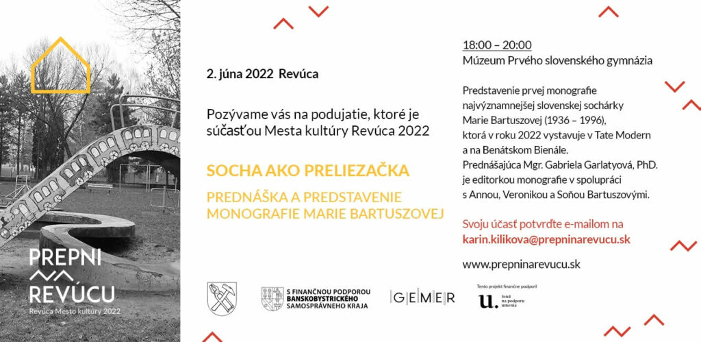 REVÚCA - Mestské kultúrne stredisko Revúca vás pozýva 2. júna na podujatie, ktoré je súčasťou Mesta kultúry Revúca 2022. Od 18-tej do 20-tej hodiny si v Múzeu Prvého slovenského gymnázia pre vás pripravili predstavenie prvej monografie najvýznamnejšej slovenskej sochárky Marie Bartuszovej (1936 - 1996), ktorá v roku 2022 vystavuje v Tate Modern v Spojenom kráľovstve a na Benátskom Bienále.