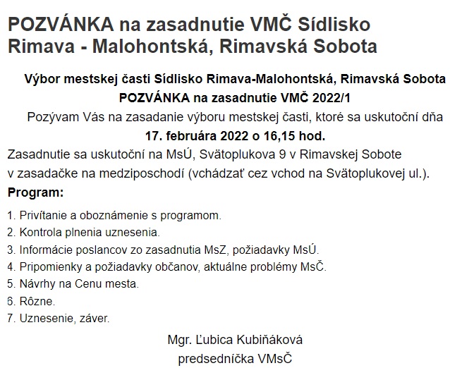 RIMAVSKÁ SOBOTA - Výbor mestskej časti Sídlisko Rimava-Malohontská pozýva na zasadanie výboru mestskej časti, ktoré sa uskutoční 17. februára 2022 o 16:15 hod. Zasadnutie sa uskutoční na Mestskom úrade v zasadačke na medziposchodí.