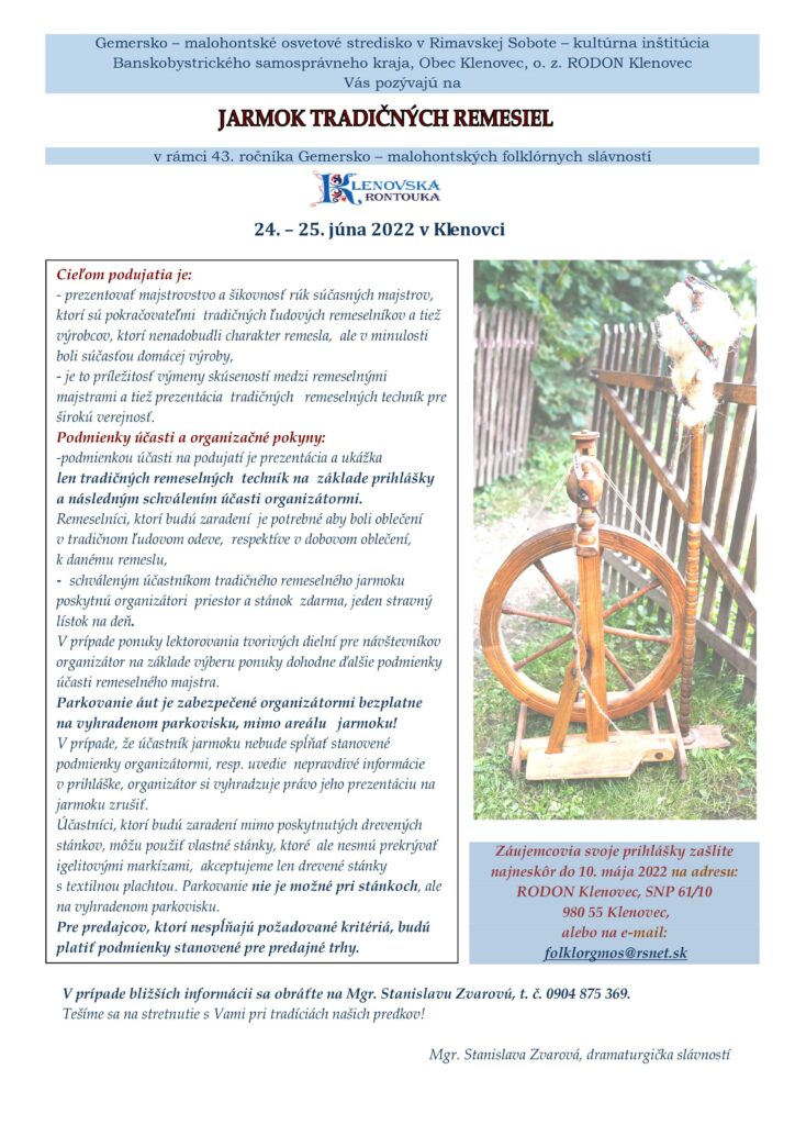 KLENOVEC - Gemersko - malohontské osvetové stredisko v Rimavskej Sobote - kultúrna inštitúcia Banskobystrického samosprávneho kraja, Obec Klenovec a občianske združenie RODON Klenovec vás pozývajú na Jarmok tradičných remesiel v rámci 43. ročníka Gemersko – malohontských folklórnych slávností - Klenovská rontourka, ktoré sa uskutočnia 24. a 25. júna.