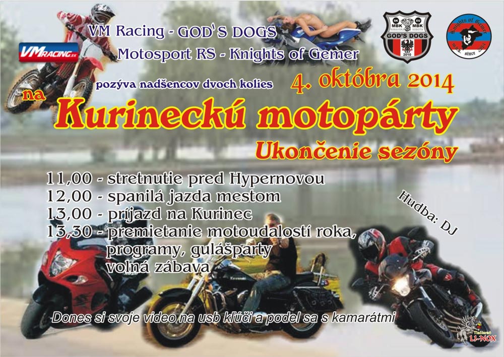 Stretnutie na parkovisku pred Hypernovou, spanilá jazda Rimavskou Sobotou či zastávka pri mestskom cintoríne čaká tento rok všetkých motorkárov, ktorí prídu v sobotu (4. októbra) ukončiť tohtoročnú motorkársku sezónu. Ako pre Rimava.sk uviedol prezident a zakladateľ klubu Knights of Gemer Miroslav Stieranka, tento rok očakávajú väčšiu účasť na ukončení sezóny, pretože sa pri tejto príležitosti v meste spojili všetky tri motorkárske kluby - VM Racing, God´s Dogs a Motosport RS – Knights of Gemer.