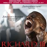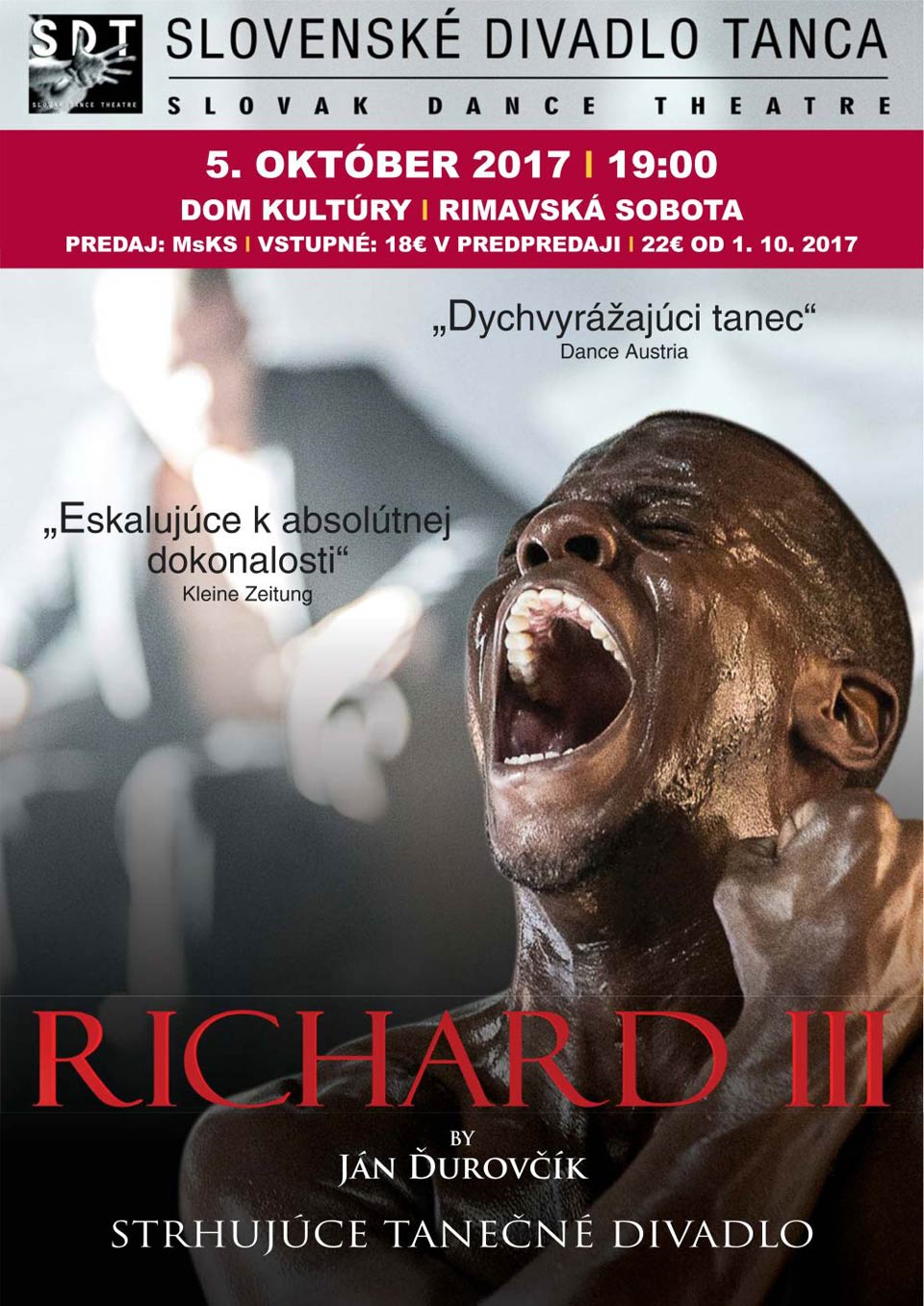 Uznávaný slovenský režisér a choreograf Ján Ďurovčík opäť prichádza do Rimavskej Soboty, tento krát s nezabudnuteľným tanečným predstavením RICHARD III. Strhujúci príbeh z pera Williama Shakespeara uvedie v spolupráci so špičkovými sólistami Slovenského divadla tanca 5. októbra o 19.00 hod. na doskách divadelnej sály Domu kultúry. Vstupné: 18 eur v predpredaji v TIC a MsKS.