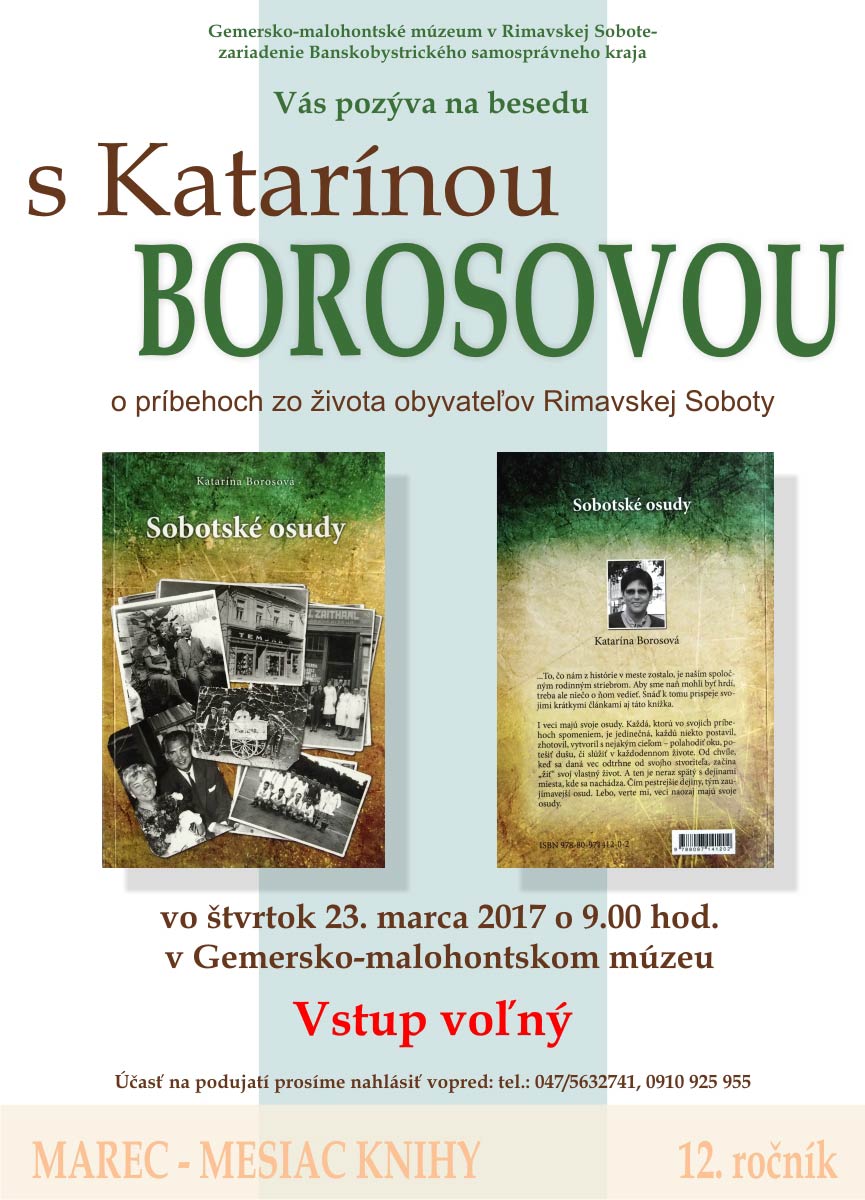 Marec - mesiac knihy, taký je názov podujatia, v rámci ktorého Gemersko-malohontské múzeum v Rimavskej Sobote už 12. rok prezentuje zaujímavé knižné tituly od vybraných regionálnych autorov. Tento rok si v múzeu pripravili besedu s učiteľkou slovenského jazyka a angličtiny, ale aj autorkou knihy Sobotské osudy, Katarínou Borosovou. Beseda sa uskutoční vo štvrtok, 23. marca o 9:00 hod. v priestoroch múzea. Rimava.sk o tom informovala knihovníčka múzea Iveta Krnáčová.