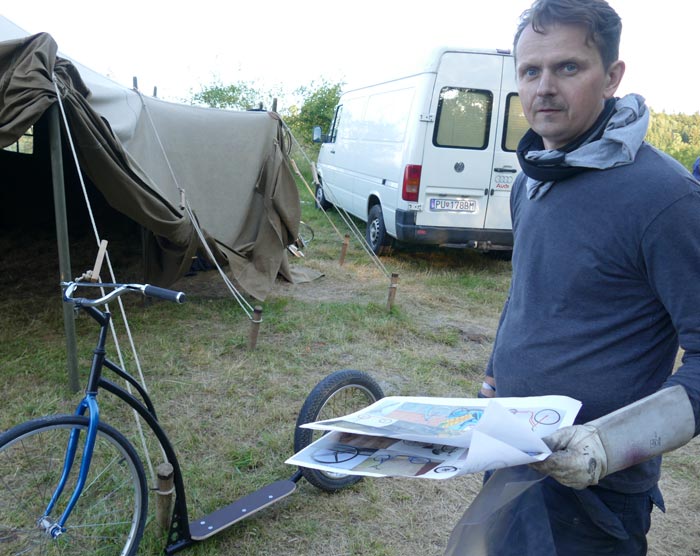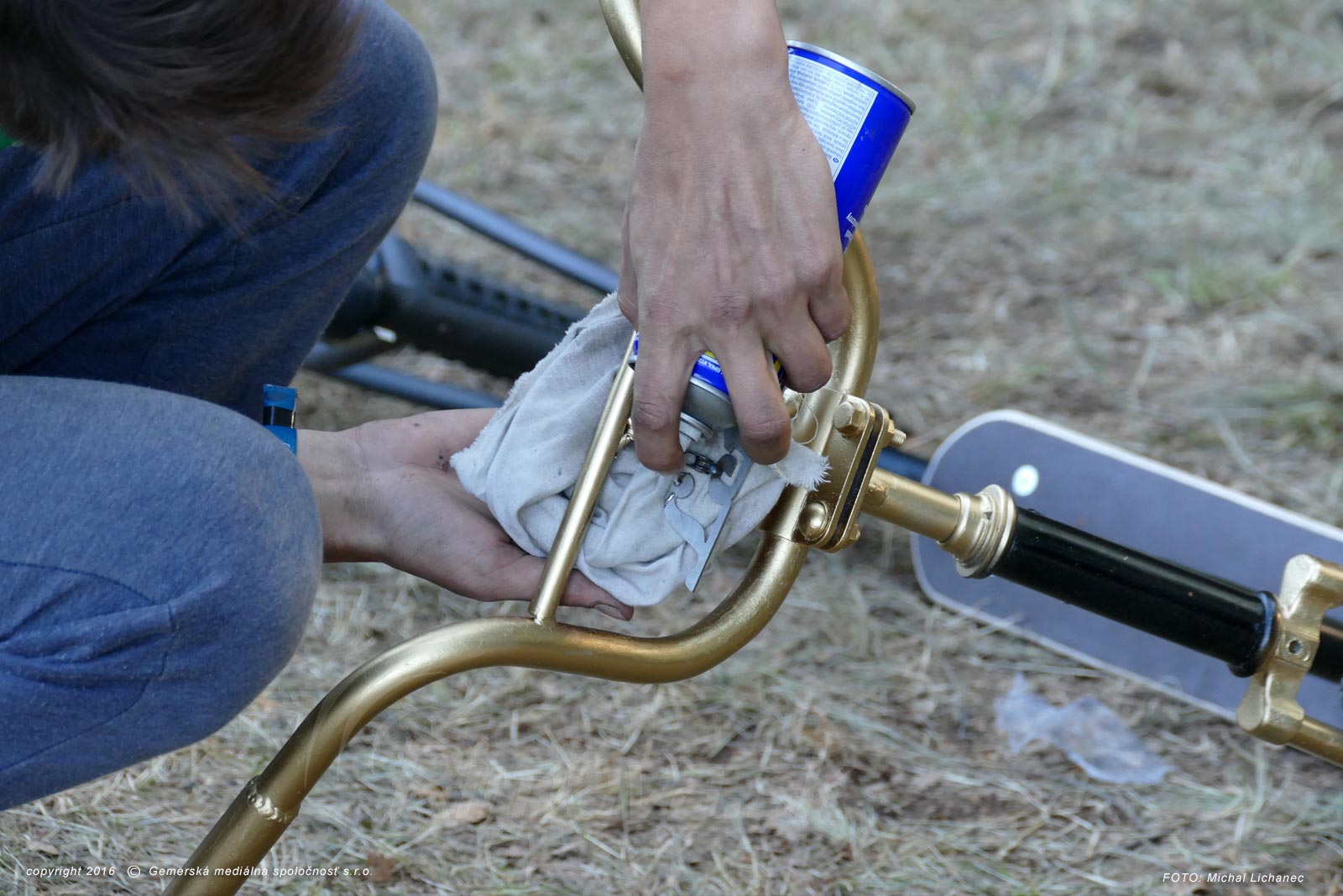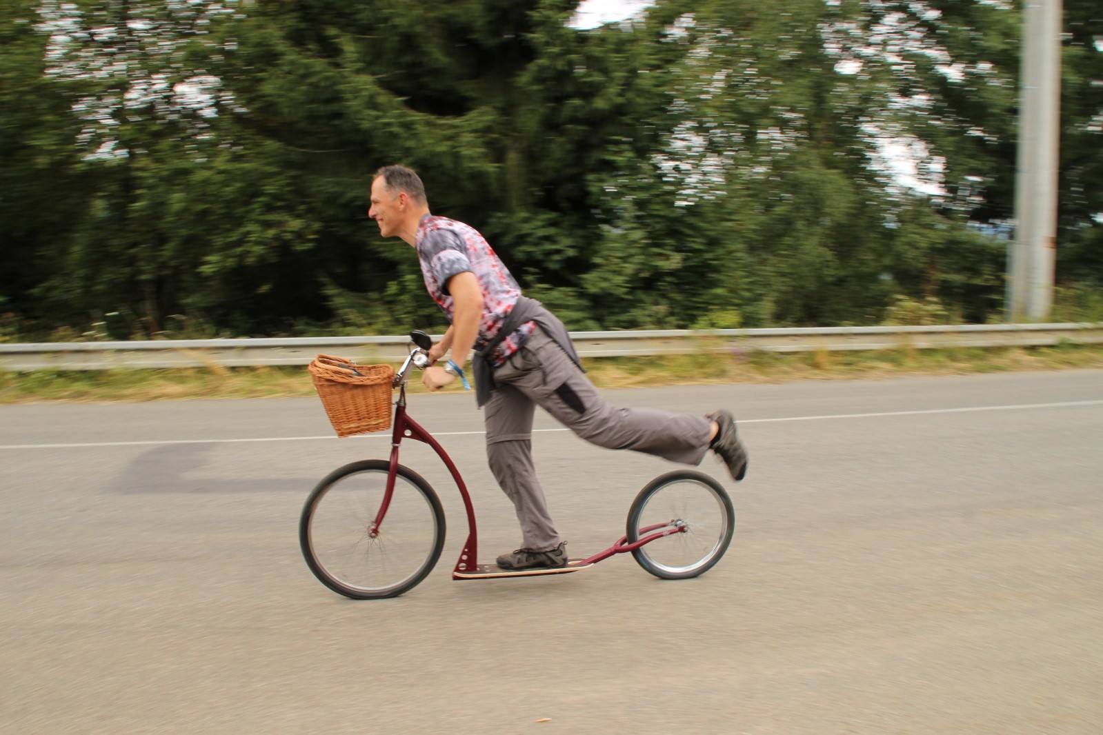 „Dostali sme k dispozícii vyše 20 kostier bicyklov, ktoré sme v prvý deň rozobrali a roztriedili na súčiastky, ktoré sme potom komponovali do tej kolobežky. Veľmi dôležitý komponent je predná časť s vidlicou a kormidlom a tiež rúra, ktorá nám umožní dostať sa na najnižší bod, kde máme vzdialenosť od zeme 8 cm,“ uviedol Schanz. Hlavnú rúru museli prispôsobiť geometrii kolesa, keďže mali v dielni rôzne veľkosti. Podľa jeho slov si každý účastník dielne rúru ohol sám pomocou ohýbačky na rúry. „Každý si spravil vlastnú kôpku všetkých komponentov a potom podľa poradia chodili k stolu, kde som to spolu s nimi dal dokopy, zvaril a nameral. Oni si kontrolovali, či to je v osi, takže zodpovednosť za kvalitu bola na nich,“ dodal.