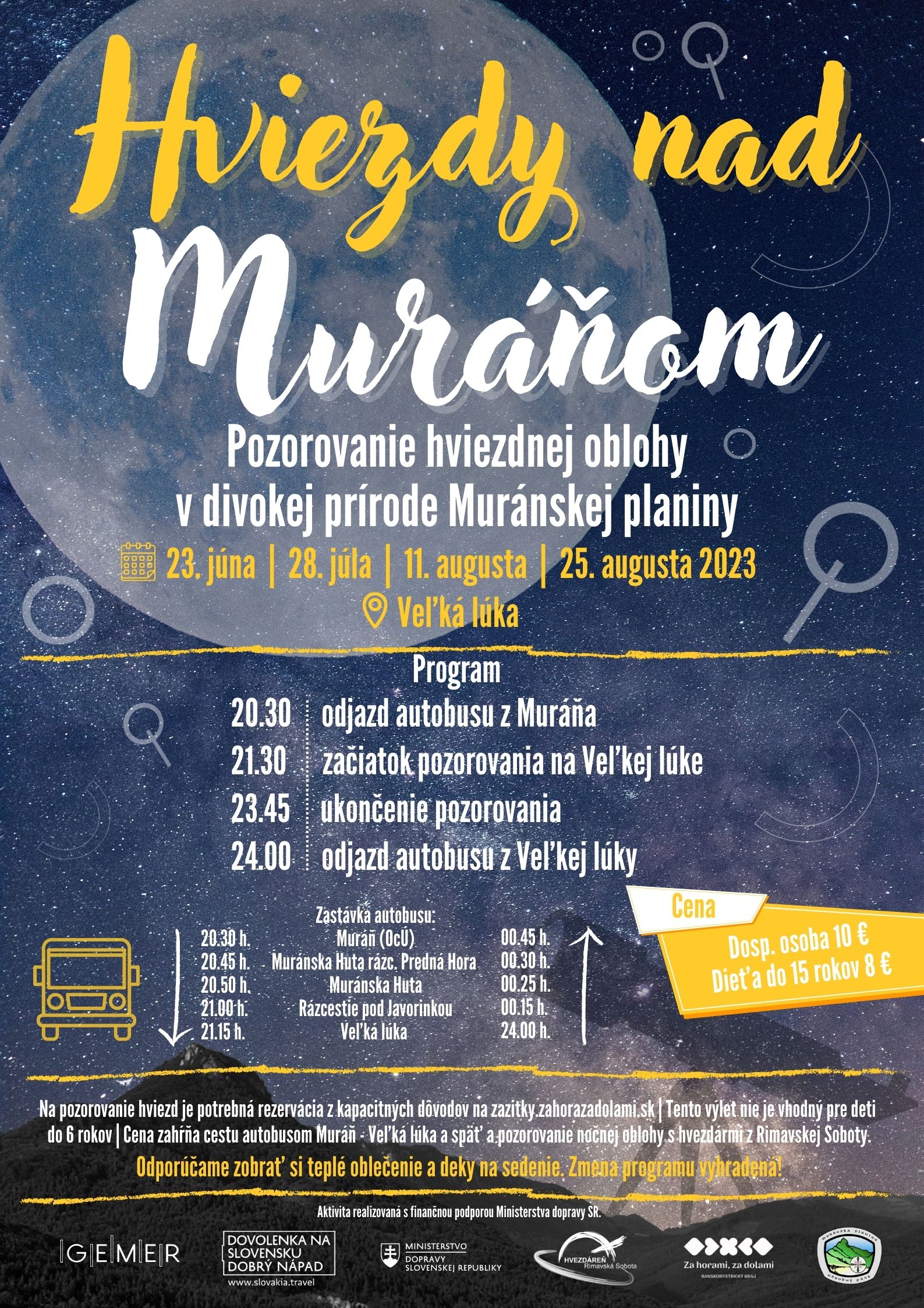 Hviezdy, planéty a iné zaujímavosti môžete skúmať počas štyroch termínov v letnej sezóne a to 23. júna, 28. júla, 11. augusta a 25. augusta 2023 od 20:30 až do polnoci. Každý z týchto termínov prinesie účastníkom jedinečný pohľad na nočnú oblohu s bohatými objektami a úkazmi vesmíru. Pre všetkých účastníkov bude zabezpečená aj spoločná doprava z obce Muráň priamo na Veľkú lúku, kde sa odohrá pozorovanie s pracovníkmi hvezdárne v Rimavskej Sobote.