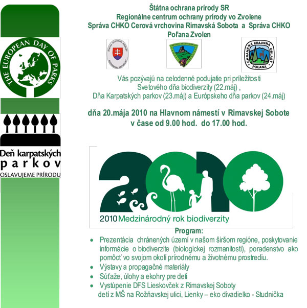 Prezentácia chránených území v našom regióne, výstavy, súťaže a ekohry pre deti ako aj vystúpenia škôlkarov a malých folkloristov budú súčasťou štvrtkového celodenného programu na Hlavnom námestí. Koná sa pri príležitosti Svetového dňa biodiverzity, Dňa Karpatských parkov a Európskeho dňa parkov. Rimava.sk informovala Jana Garayová zo Štátnej ochrany prírody, Správa CHKO Cerová vrchovina.
