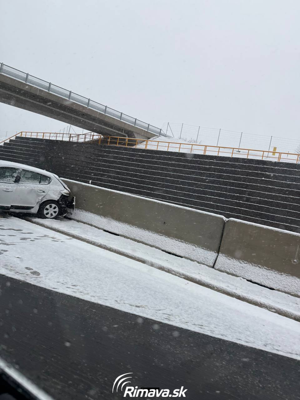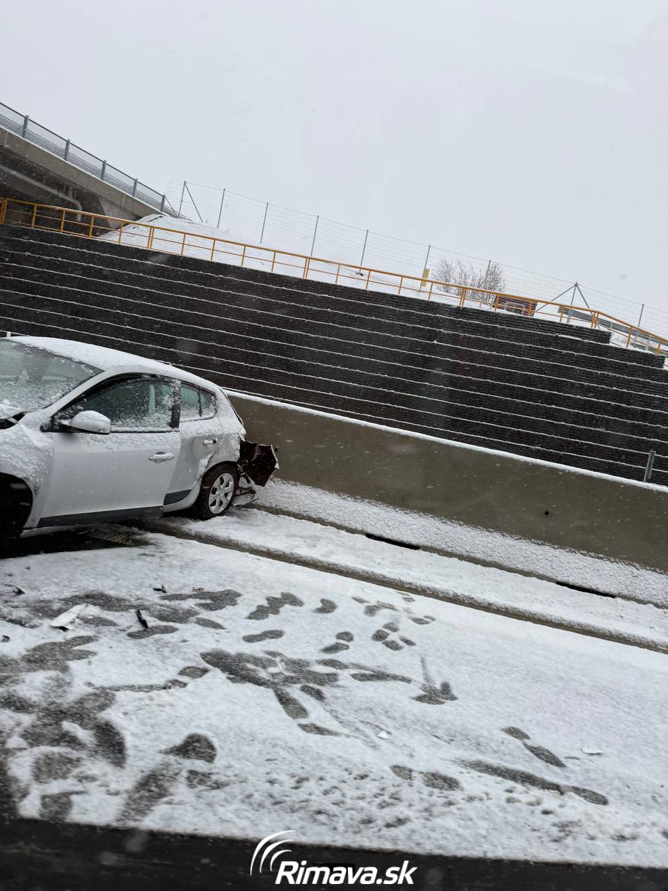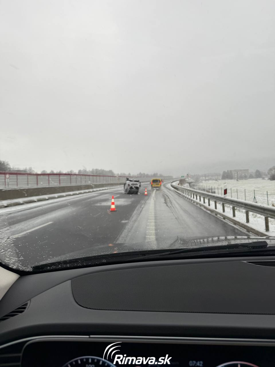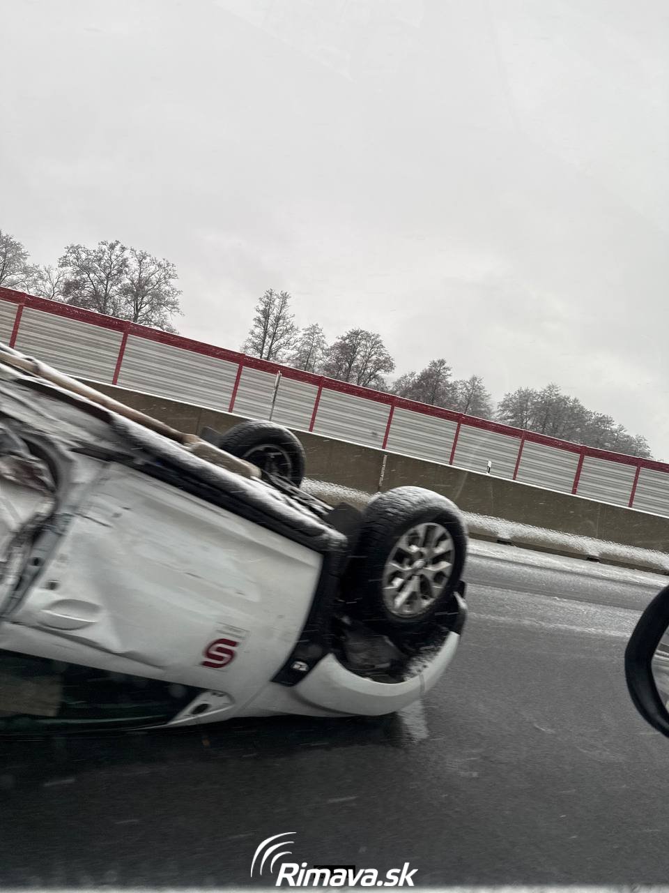 Len o pár metrov ďalej sa nachádza ďalšie havarované auto. V tomto prípade je jedno z osobných vozidiel prevrátené na streche. Podľa dostupných informácií je táto časť cesty v týchto chvíľach veľmi zľadovatená, pričom sneženie situáciu naďalej zhoršuje.
