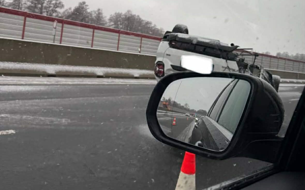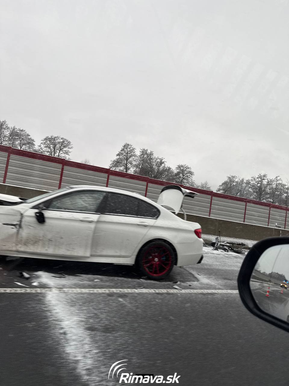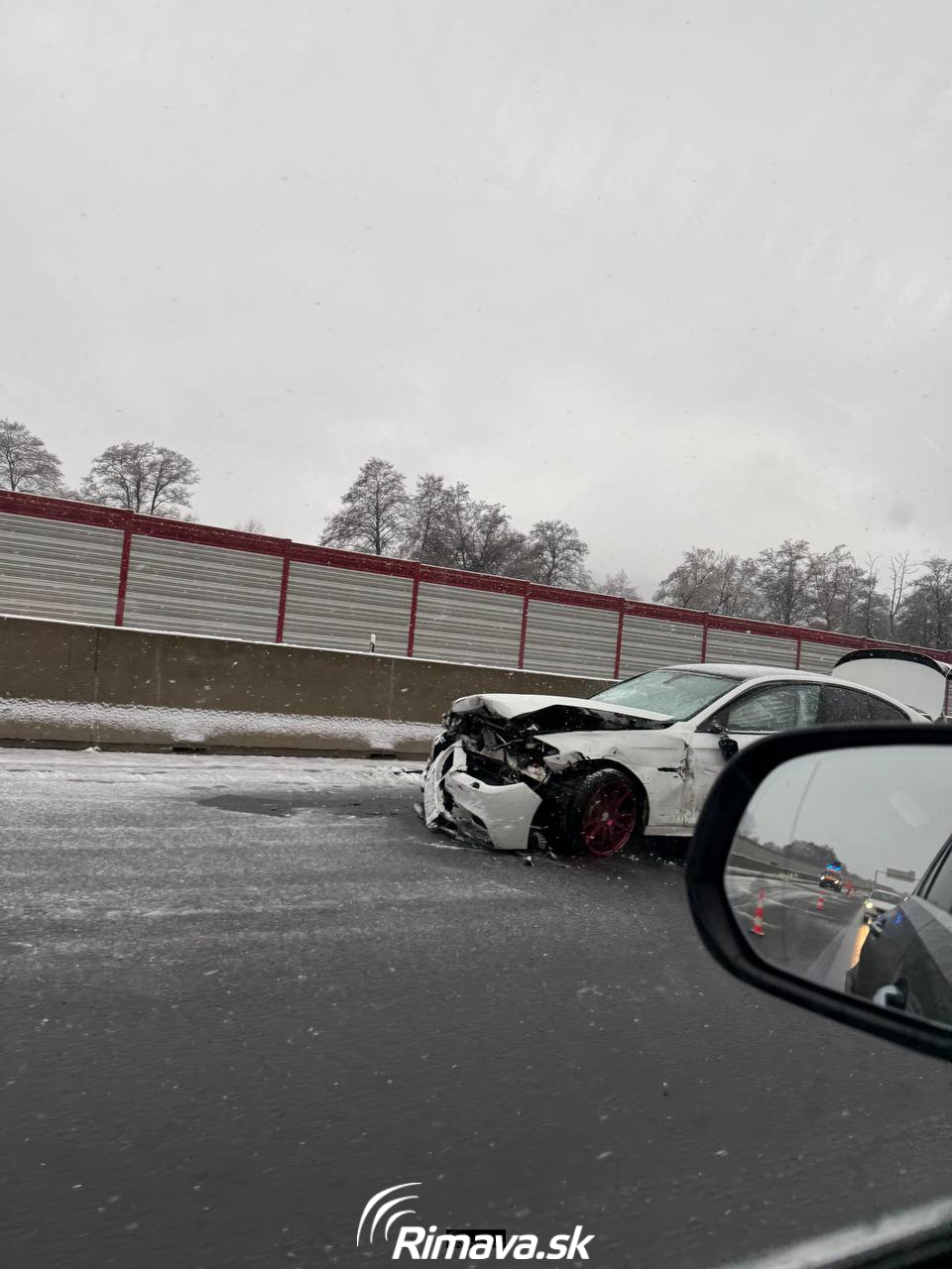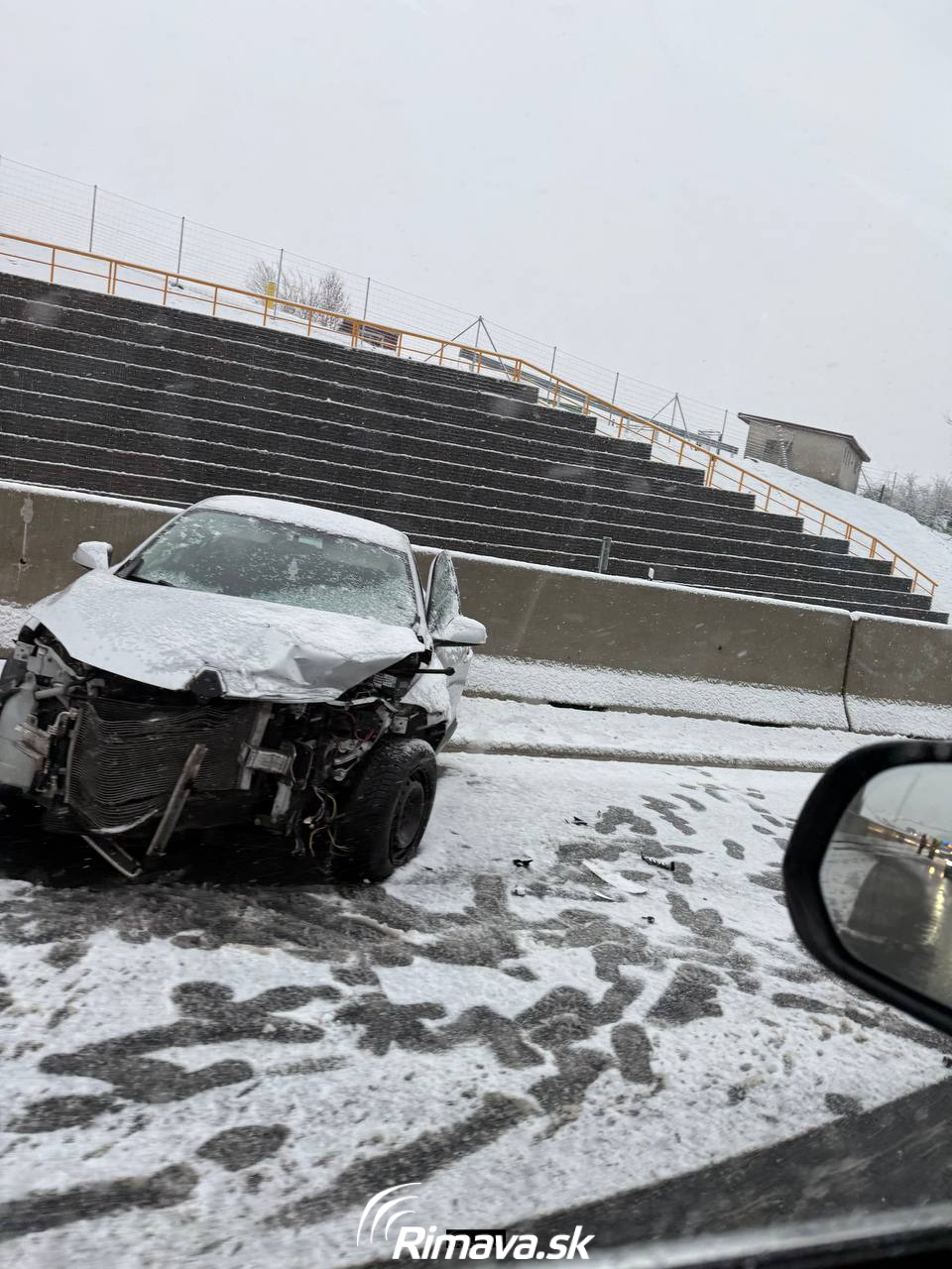 Len o pár metrov ďalej sa nachádza ďalšie havarované auto. V tomto prípade je jedno z osobných vozidiel prevrátené na streche. Podľa dostupných informácií je táto časť cesty v týchto chvíľach veľmi zľadovatená, pričom sneženie situáciu naďalej zhoršuje.