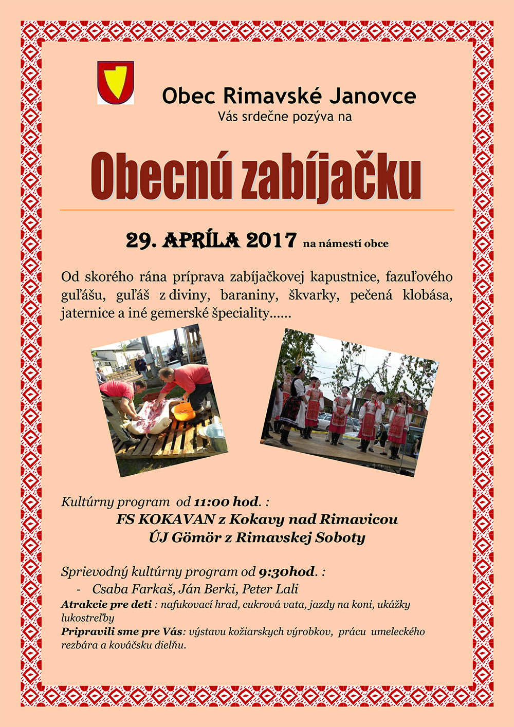 Na obecnej zabíjačke, ktorá sa v Rimavských Janovciach stáva tradíciou, nájdete aj tento rok množstvo špecialít, novinkou bude domáce pivo, ktoré príde predstaviť Sládek z Revúcej. Ako ďalej Rimava.sk informoval starosta obce Rimavské Janovce, zabíjačkové špeciality počas piateho ročníka budú podávať na námestí v sobotu, 29. apríla, už približne od 8:00 - 8:30 hodiny. „Oproti vlaňajšku chceme pripraviť o jeden kotlík guľášu navyše,“ avizuje starosta, podľa ktorého minulý rok prišlo mnoho ľudí a chcú aby sa ušlo ozaj každému. „S návštevnosťou sme boli spokojní, prišli ľudia z celého okolia a bolo ich dosť. Vieme to aj podľa toho, lebo nám nič z výrobkov neostalo,“ dodal s úsmevom starosta, ktorého obec leží vo výhodnej polohe, neďaleko okresného mesta Rimavská Sobota.