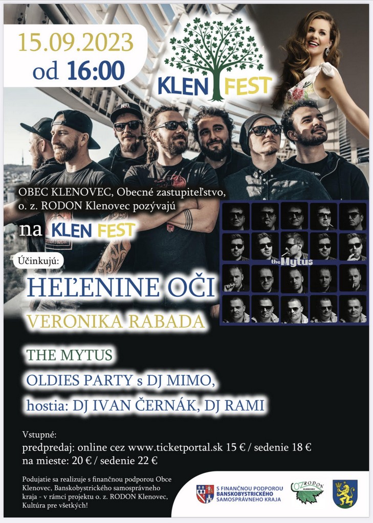 Fanúšikov na Klenfeste poteší aj speváčka Veronika Rabada a určite aj populárne Heľenine oči. Tešiť sa môžete aj na oldies party s DJ-om Mimom a prídu aj hostia, DJ Ivan Černák a DJ Rami. Vstupenky na podujatie si ešte stále môžete zakúpiť vopred.