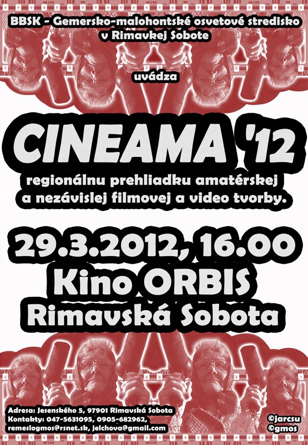 Amatérsku a nezávislú filmovú tvorbu priblíži zajtrajšia regionálna prehliadka CINEAMA 2012, v rámci ktorej sa predstaví desať autorov, medzi nimi deti z reedukačného centra v Čerenčanoch aj absolventka Akadémie umení, Rimavskosoboťanka Jana Janove. Prehliadka sa začne o 16.00 hod. v rimavskosobotskom Kine Orbis, organizuje ju Gemersko-malohontské osvetové stredisko (GMOS).
