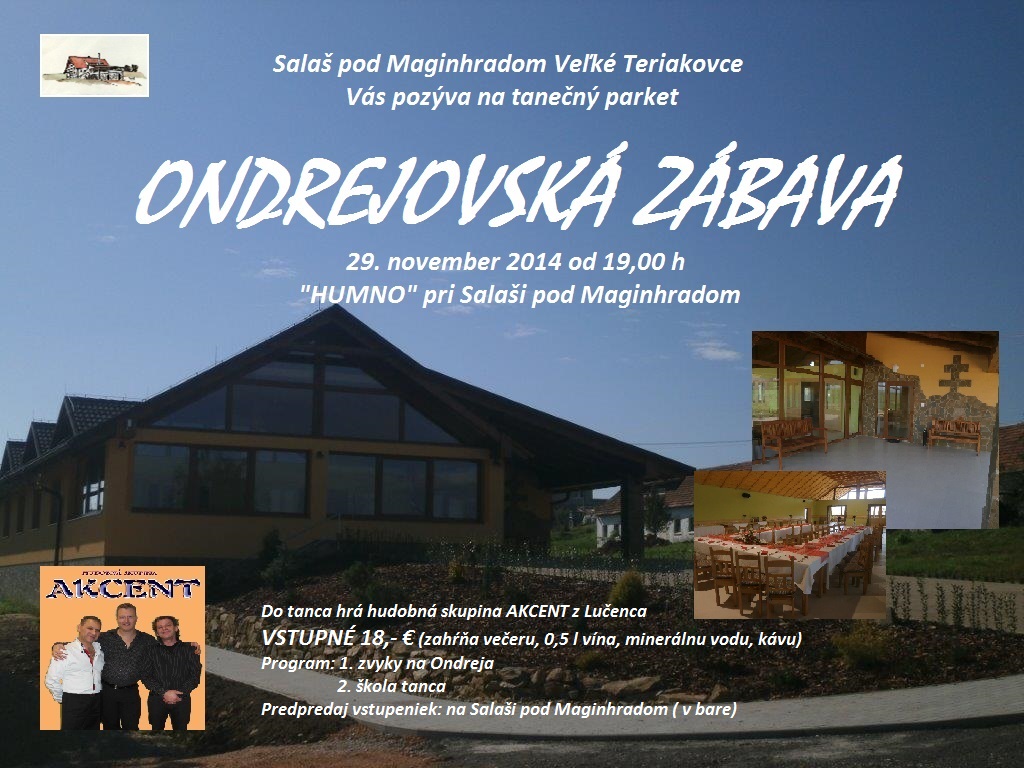 Neváhajte a príďte sa zabaviť v sobotu, 29. novembra v Humne vo Veľkých Teriakovciach. Do tanca bude hrať hudobná skupina AKCENT z Lučenca, vstupné je 18 eur. (vrátane občerstvenia - večera, káva, minerálka, 0,5 l vína).