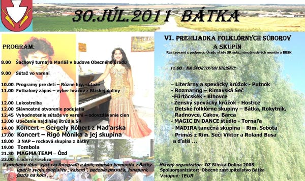 Po šiestykrát sa v poslednú júlovú sobotu, 30. júla, stretnú v Bátke obce Blžskej doliny, pripravený je šachový aj mariášový turnaj, súťaž vo varení, folklórne vystúpenia, koncerty, ohňová šou a ľudová veselica. Rimava.sk informoval starosta Bátky Zoltán Mács.