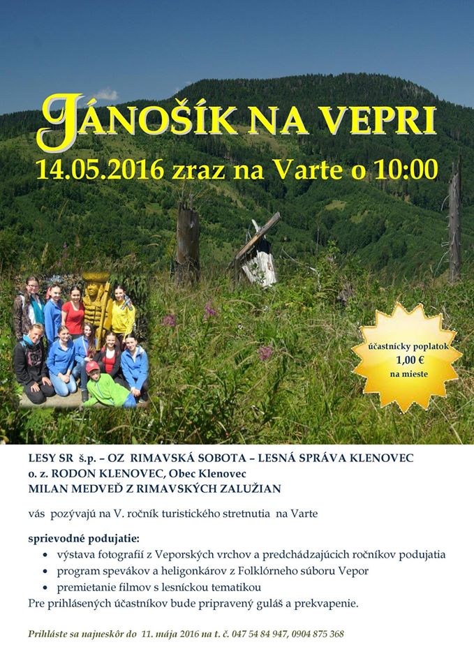 Ak patríte medzi milovníkov prírody a zdolať nejaký vrch Vám nerobí problémy, potom by ste si nemali nechať ujsť už tradičné priateľské stretnutie od najmenších po najstarších, v krásnej prírode Veporských vrchov, s názvom Jánošík na Vepri. V poradí už piaty ročník podujatia sa uskutoční v sobotu, 14. mája o 10:00 hod, zraz je podľa organizátorov na Varte.