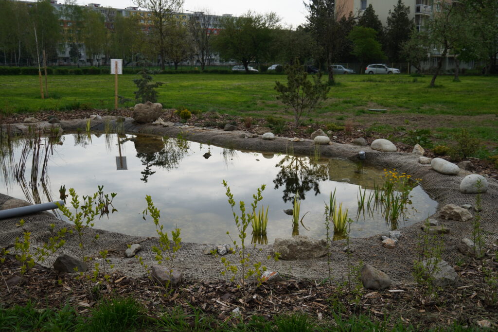 Jazierko zrealizoval Radovan Slocík z firmy Okrasné škôlky. "Sú tu dva druhy kosatcov, jeden je dvojfarebný so žltozelenými listami a druhý bude mať fialovomodrý kvet. Je tu tiež nezábudka močiarna, pontedéria srdcovitá, žabník skorocelový, vrbica vŕbolistá, štiavec vodný, truskavec obyčajný, pálka širokolistá, pálka najmenšia a iskerník vodný. Ten sa v stojatých vodách presúva z brehu na breh a sem tam niekde zakorení. Lekná su posadené dole v hlbokej zóne, tie sa vytiahnu hore v lete. Pribudne sem aj nejaká rybka," povedal Slocík, ktorý na realizáciu použil gumokaučuk, vhodný do prírodných jazierok.