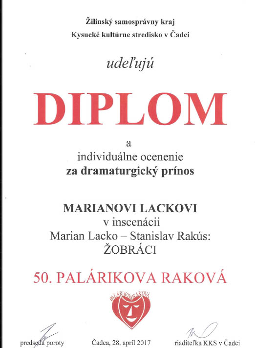 Keďže za 1. miesto som okrem Diplomu dostal aj Zlatú medailu Jána Palárika a tiež individuálne ocenenie Diplom za dramaturgický prínos a k tomu Striebornú medailu Jána Palárika, bolo to neuveriteľne úspešné predstavenie. A to pôvodne vzniklo vlastne „len“ pri príležitosti spomienkového večera k 75. narodeninám Stanislava Rakúsa. Za takmer dva roky hrania a po 25 reprízach treba povedať, že táto hra je divákmi veľmi kladne prijímaná po celom Slovensku, od Trebišova po Bratislavu! Žobráci, ako aj celá tvorba Stanislava Rakúsa je taká „moja srdcovka“ od roku 1985, keď som sa s touto tvorbou aj autorom zoznámil. A samotnú novelu Žobráci som inscenoval po rokoch 1997 (činohra s Divadlom PICTUS) a 2005 (divadlo mladých s Divadlom Alterna) už tretí krát. Tentoraz ako monodrámu a zdá sa, že tu sa mi podarilo najviac priblížiť poetike literárnej predlohy.