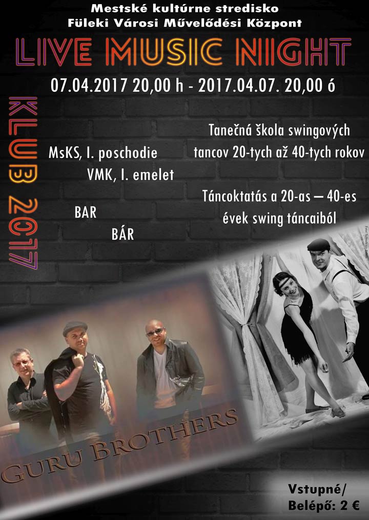Vo Fiľakove to bude v najbližší piatok žiť hudbou a spevom. V piatok, 7. apríla od 20:00 hod sa predstaví v Mestskom kultúrnom stredisku tamojšia kapela Guru Brothers. Táto fiľakovská banda bude hosťom druhej série klubových koncertov KLUB 2017- Live Music Night. „Kapela je už roky súčasťou hudobného života nielen v rámci nášho regiónu, ale predstavili sa aj vo semifinále slovenského národného kola Eurovízie v roku 2010,“ uviedla pre Rimava.sk riaditeľka MsKS vo Fiľakove Andrea Illés Kósik.
