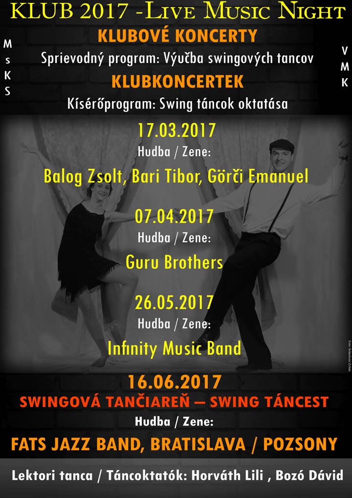 Hudba a spev budú vládnuť aj v máji. „Na pódium MsKS vstúpi kapela, ktorú doteraz nemali možnosť ani vidieť ani počuť. Je to kapela Infinity Music Band, ktorá sa predstaví najväčšími maďarskými šlágrami vo vlastnom spracovaní,“ avizuje riaditeľka. Ako ďalej priblížila, jednou z noviniek v tomto roku bude, že okrem celoročne plánovaných 6-7 miestnych skupín v júni do Fiľakova zavíta profesionálna bratislavská kapela, ktorá návštevníkov svojou swingovou hudbou vráti v čase do 20-tych až 40-tych rokov minulého storočia. Tento večer však nebude vo forme koncertu, ale v štýle tančiarne, na ktorú usporiadatelia čakajú návštevníkov v dobových šatách. Aby záujemcom nerobilo problém tancovanie na swingovú hudbu, podľa riaditeľky sa MsKS postará aj o školu tanca. Tým, ktorí navštívia klubové koncerty KLUB 2017 v prvom polroku, usporiadatelia poskytnú možnosť 20-30 minútovej školy tanca, kde Vás lektori tanca Dávid Bozó a Lili Horváth zavedú do základov swingových tancov.