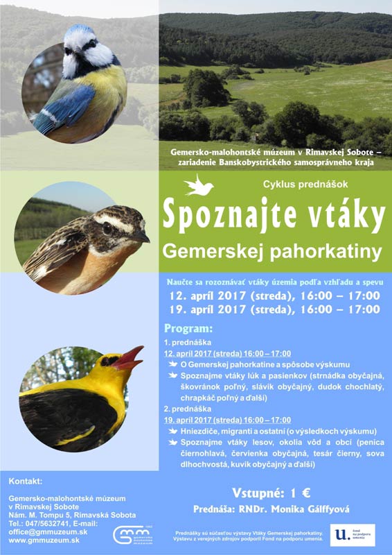 Zaujímavé podujatie ponúka aj Gemersko-malohontské múzeum v Rimavskej Sobote, ktoré si v apríli pripravilo cyklus prednášok „Spoznajte vtáky Gemerskej pahorkatiny. Prednášky, ktoré sa uskutočnia 12. a 19. apríla v priestoroch múzea, sú súčasťou výstavy Vtáky Gemerskej pahorkatiny. „V rámci prednášok sa návštevníci zoznámia s gemerskou časťou Bodvianskej pahorkatiny (Gemerská pahorkatina), so spôsobom a výsledkami výskumu na tomto území a jej vtáčími obyvateľmi ešte detailnejšie a naučia sa mnoho z nich rozlišovať nielen podľa vzhľadu, ale aj spevu a iných zvukových prejavov,“ priblížila Rimava.sk Martina Mareková, PR referentka múzea. Ako poznamenala, dĺžka prednášky je 60 minút a prednášať bude Monika Gálffyová, biologička Gemersko-malohontského múzea a autorka výstavy. Vstupné na každú prednášku je 1 euro.
