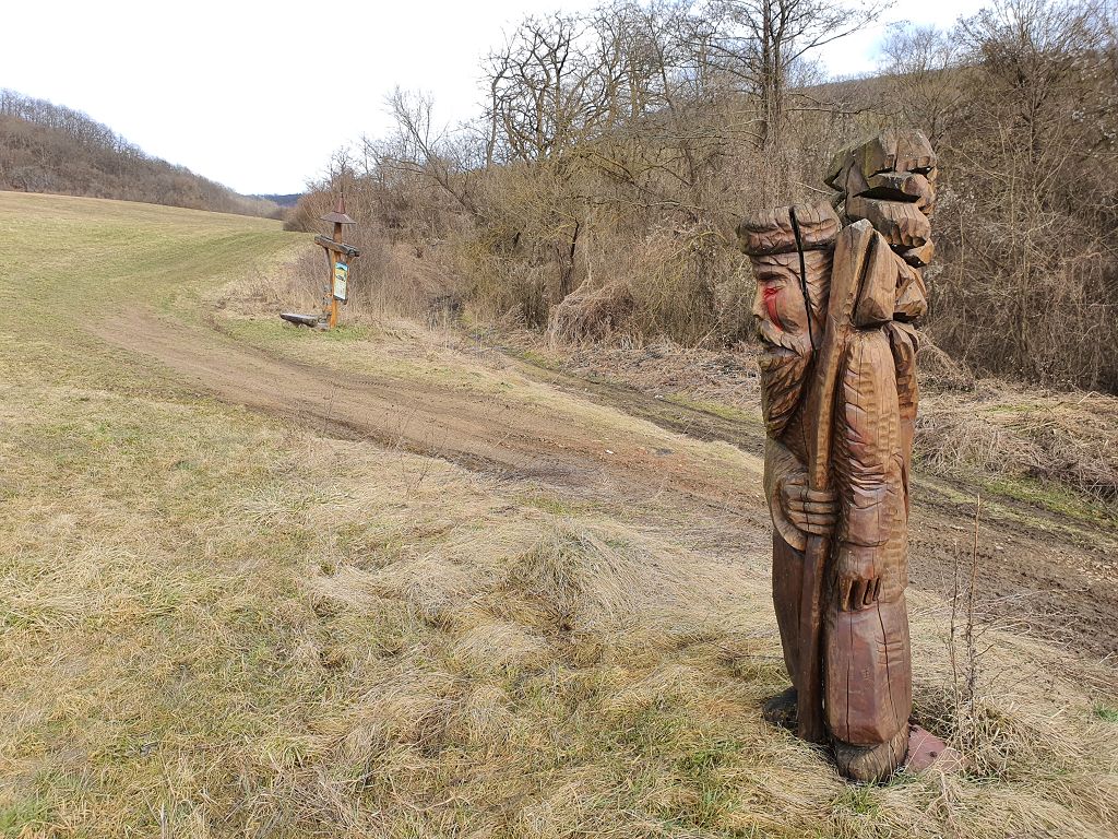 Následne po zaparkovaní stačí pokračovať poľnou cestou zhruba sto metrov k spomínanej zastávke Pieskovcové bane II. s drevenou sochou a informačnou tabuľou náučného chodníka, ktorý bol oficiálne dokončený na jeseň 2020.