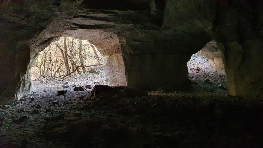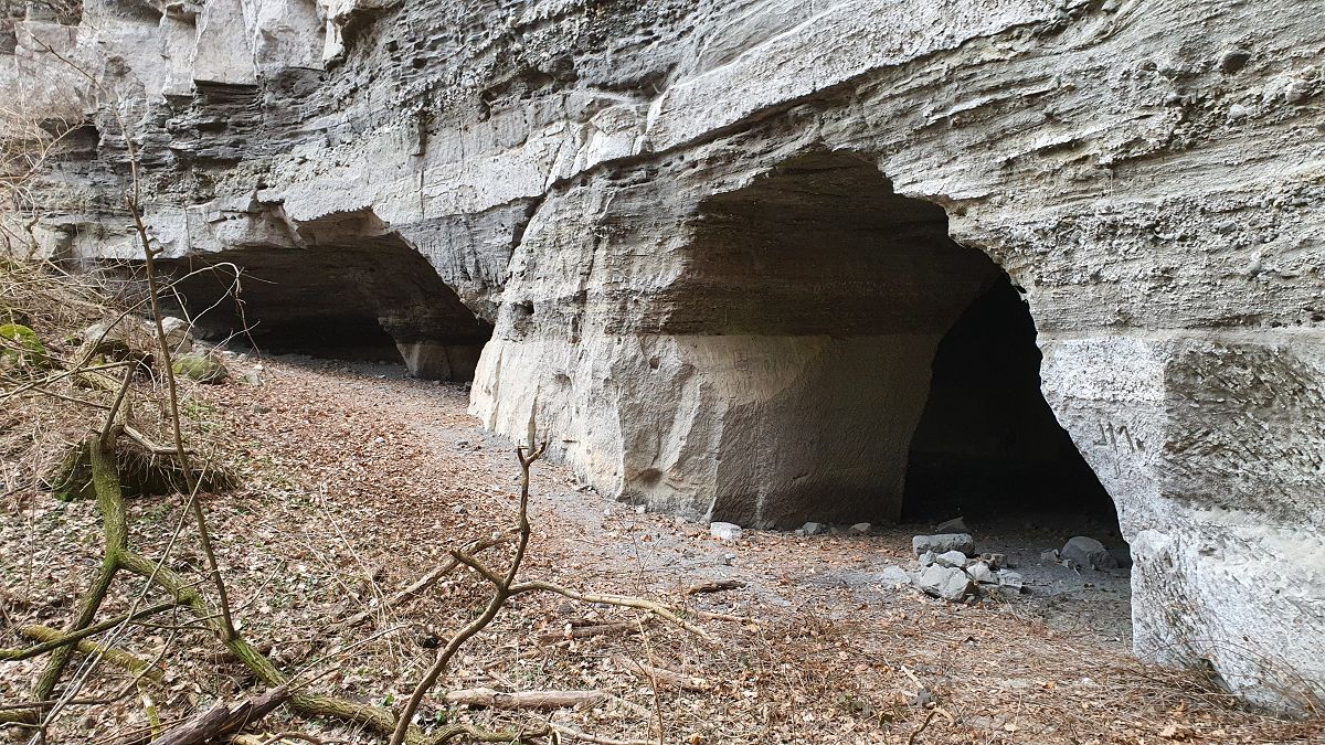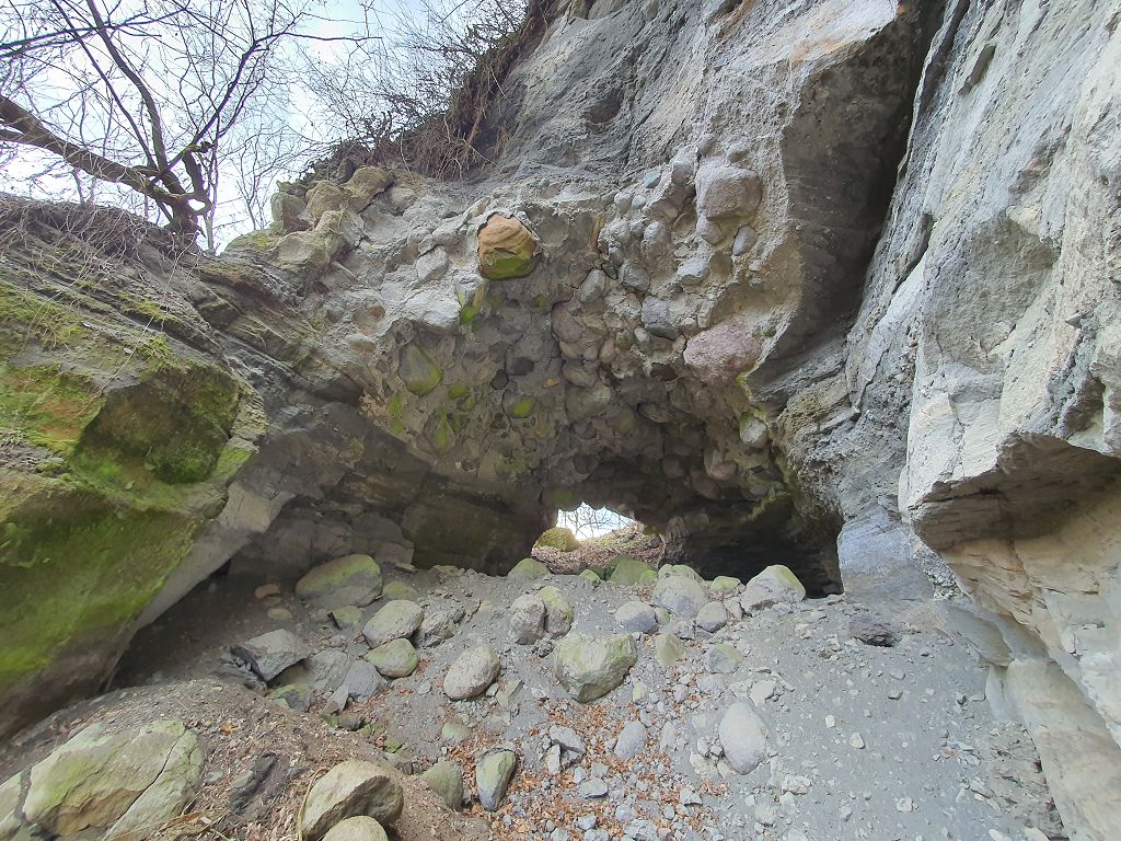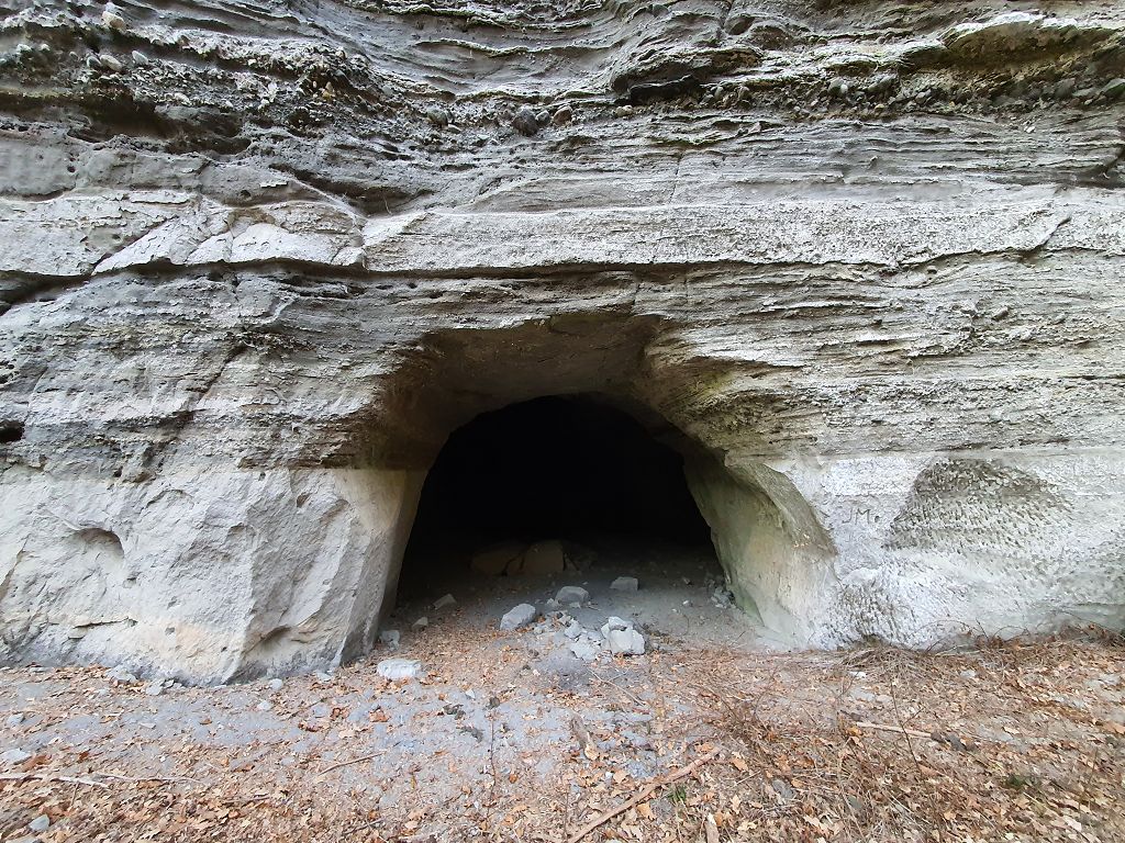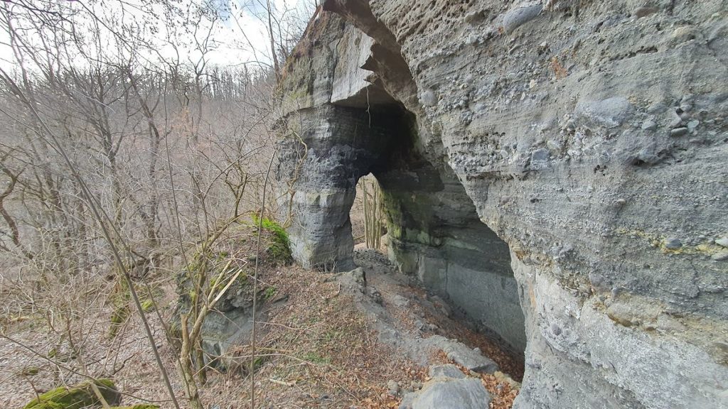 Pokračujeme ďalej po úbočí smerom do lesa a neďaleko bane nachádzame ešte zaujímavejší skalný útvar – akúsi bránu či krátky tunel, ktorý v skutočnosti vyzerá oveľa monumentálnejšie než sa nám podarilo zachytiť na fotografiách. Aj on slúžil ako zdroj staveného materiálu, na jednom mieste sú doteraz jasne vidieť stopy ťažby a opracovávania pieskovca. V okolí postupne nachádzame ďalšie menšie bane či aspoň pokusy o ich vyhĺbenie.