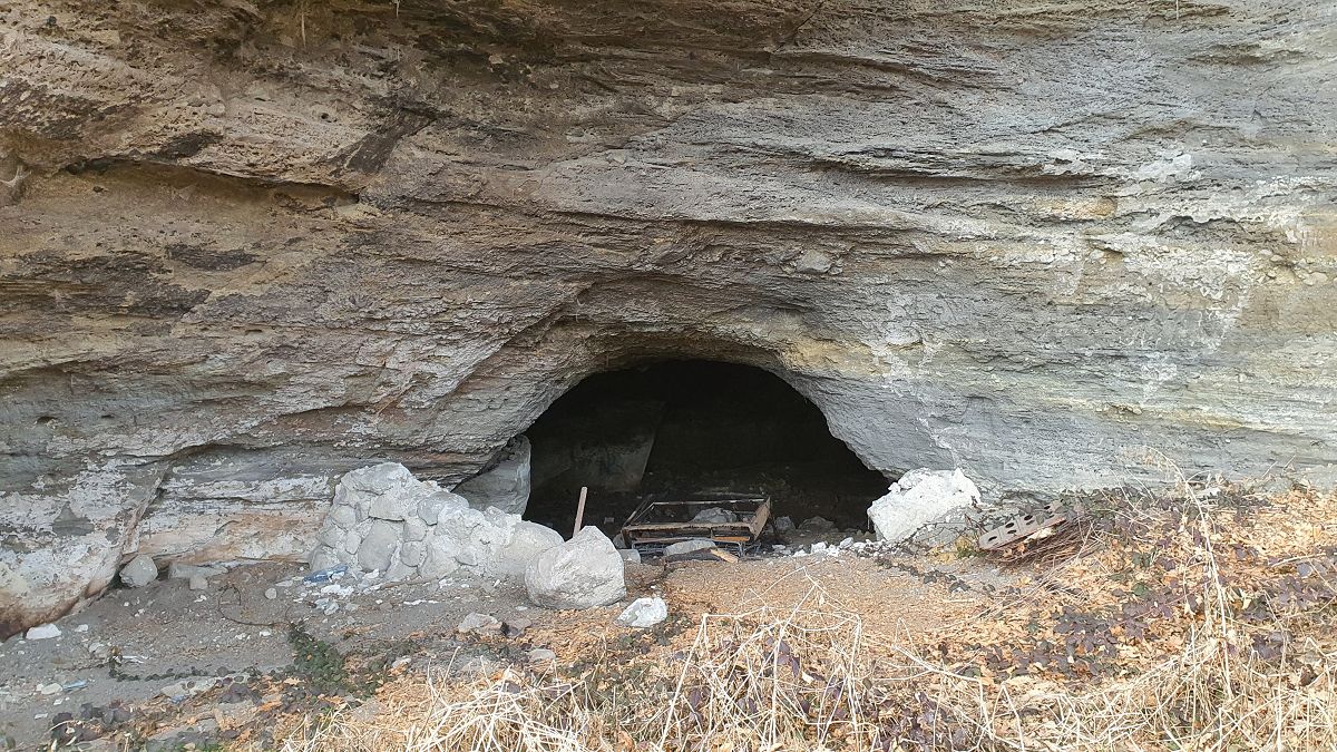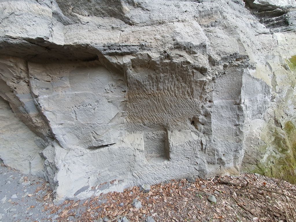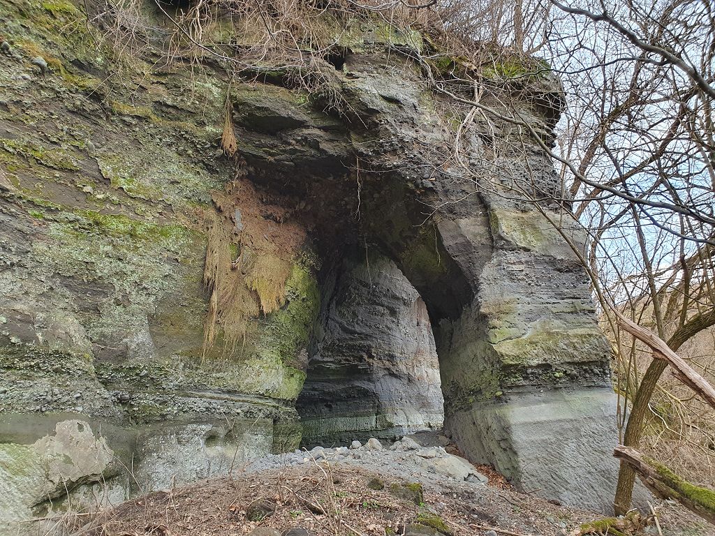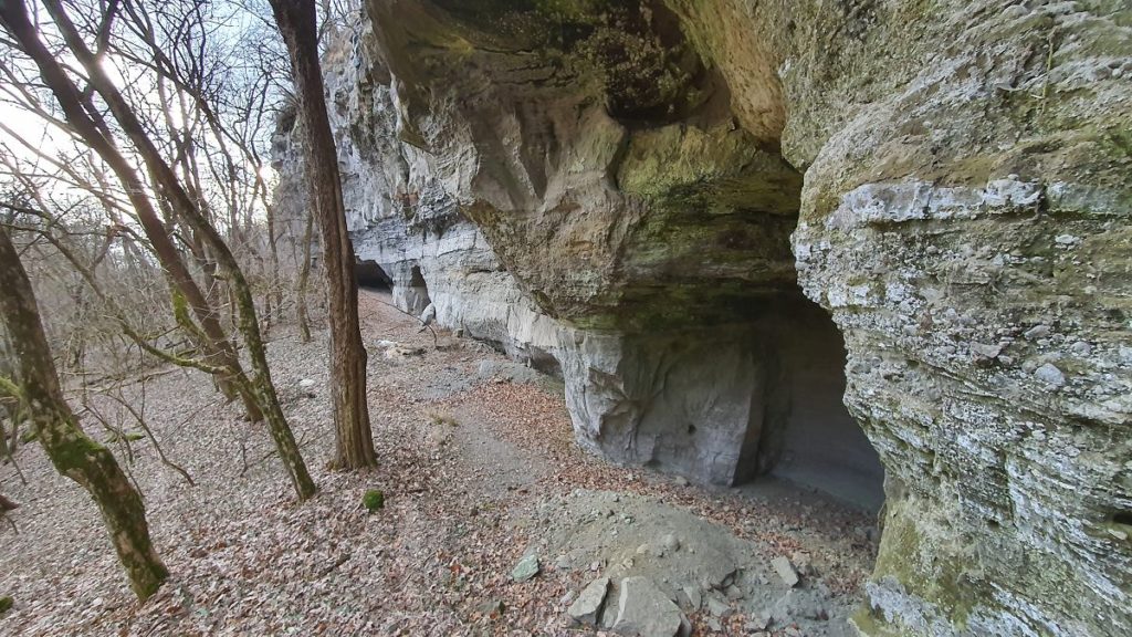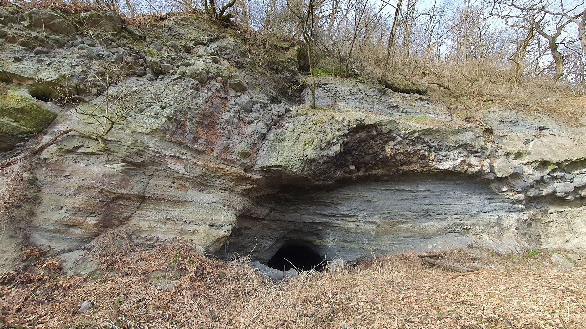 Pokračujeme ďalej po úbočí smerom do lesa a neďaleko bane nachádzame ešte zaujímavejší skalný útvar – akúsi bránu či krátky tunel, ktorý v skutočnosti vyzerá oveľa monumentálnejšie než sa nám podarilo zachytiť na fotografiách. Aj on slúžil ako zdroj staveného materiálu, na jednom mieste sú doteraz jasne vidieť stopy ťažby a opracovávania pieskovca. V okolí postupne nachádzame ďalšie menšie bane či aspoň pokusy o ich vyhĺbenie.
