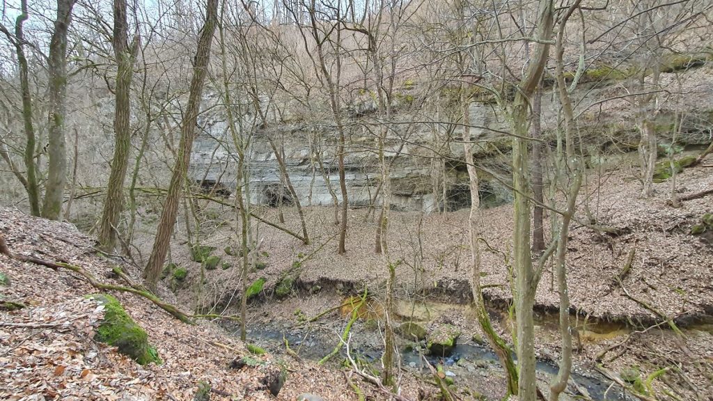 Chceme sa však pozrieť ešte ďalej a tak pokračujeme popri potoku hlbšie do lesa. Nie je kam zablúdiť, stačí sa držať v jeho údolí. Po ďalších asi 200 či 300 metroch vidíme nad potokom výrazný tektonický zlom či zosuv, v ktorom sa černejú ďalšie otvory. Samozrejme, opäť ide o staré bane, jednu dokonca s dvojitým vchodom.