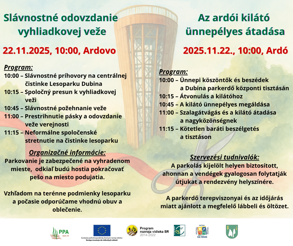 V sobotu 22. novembra 2025 sa v Ardove uskutoční slávnostné odovzdanie novej vyhliadkovej veže, ktorá vznikla v rámci rozvoja Lesoparku Dubina. Podujatie sa začne o 10:00 hodine na centrálnej čistinke lesoparku.