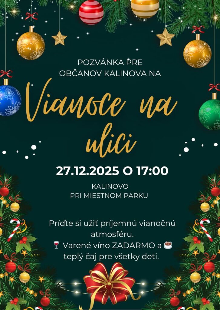 Kalinovo oživí vianočnú tradíciu. Susedské stretnutie „na ulici“ napíše novú kapitolu. Po vlaňajších skúsenostiach s neformálnymi stretnutiami v uliciach obce prichádza Kalinovo s novým formátom vianočného podujatia. Akcia s názvom „Vianoce na ulici“, ktorá nadväzuje na predchádzajúce ročníky známe ako zimné street párty, sa uskutoční v sobotu 27. decembra.